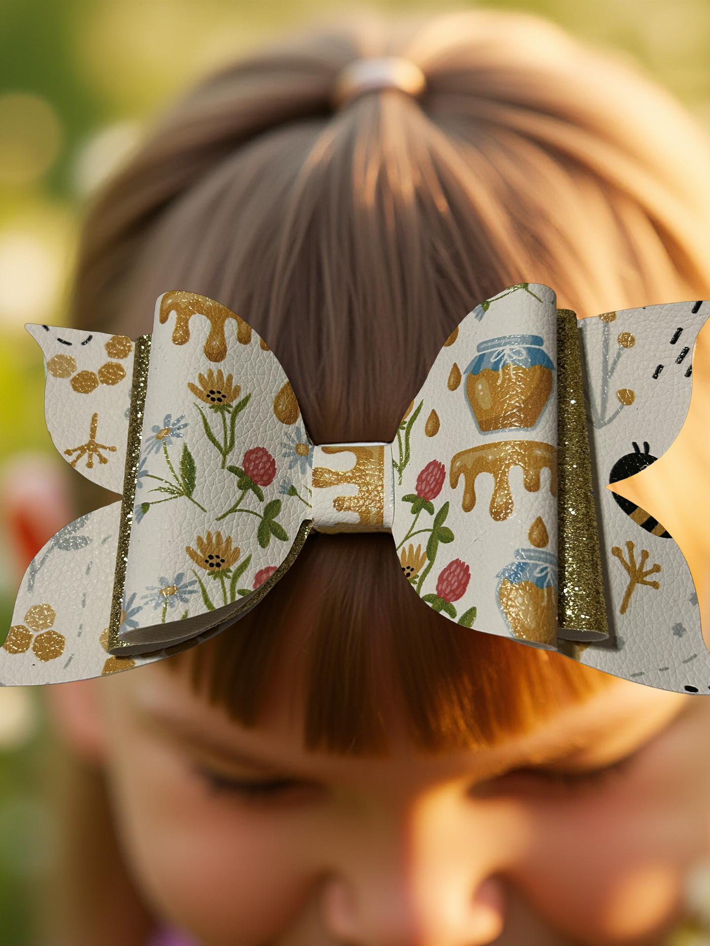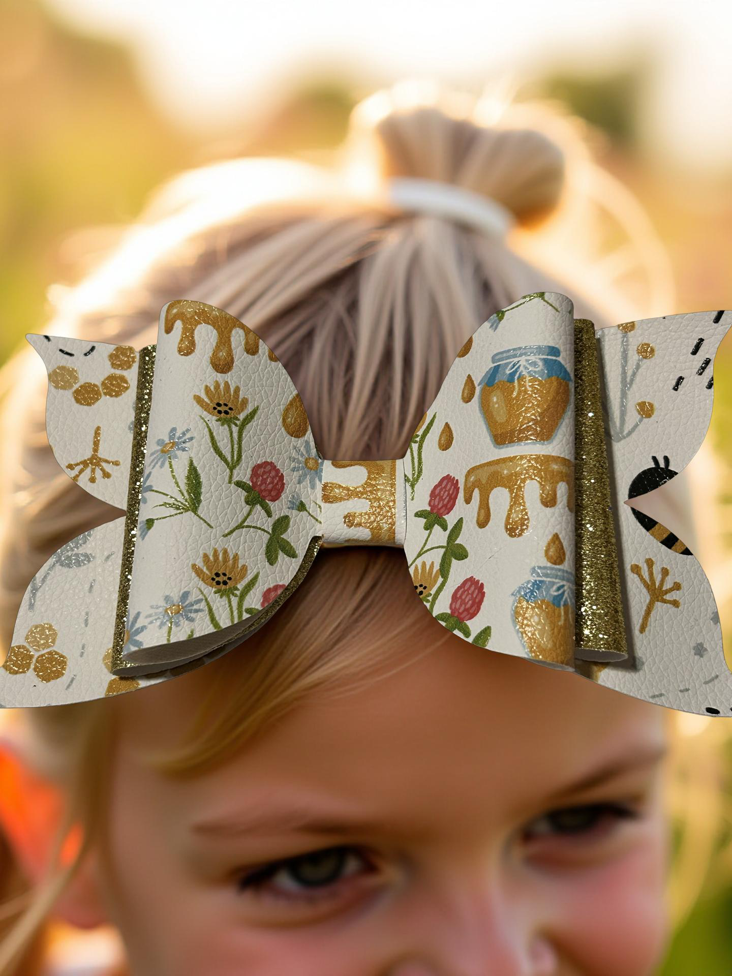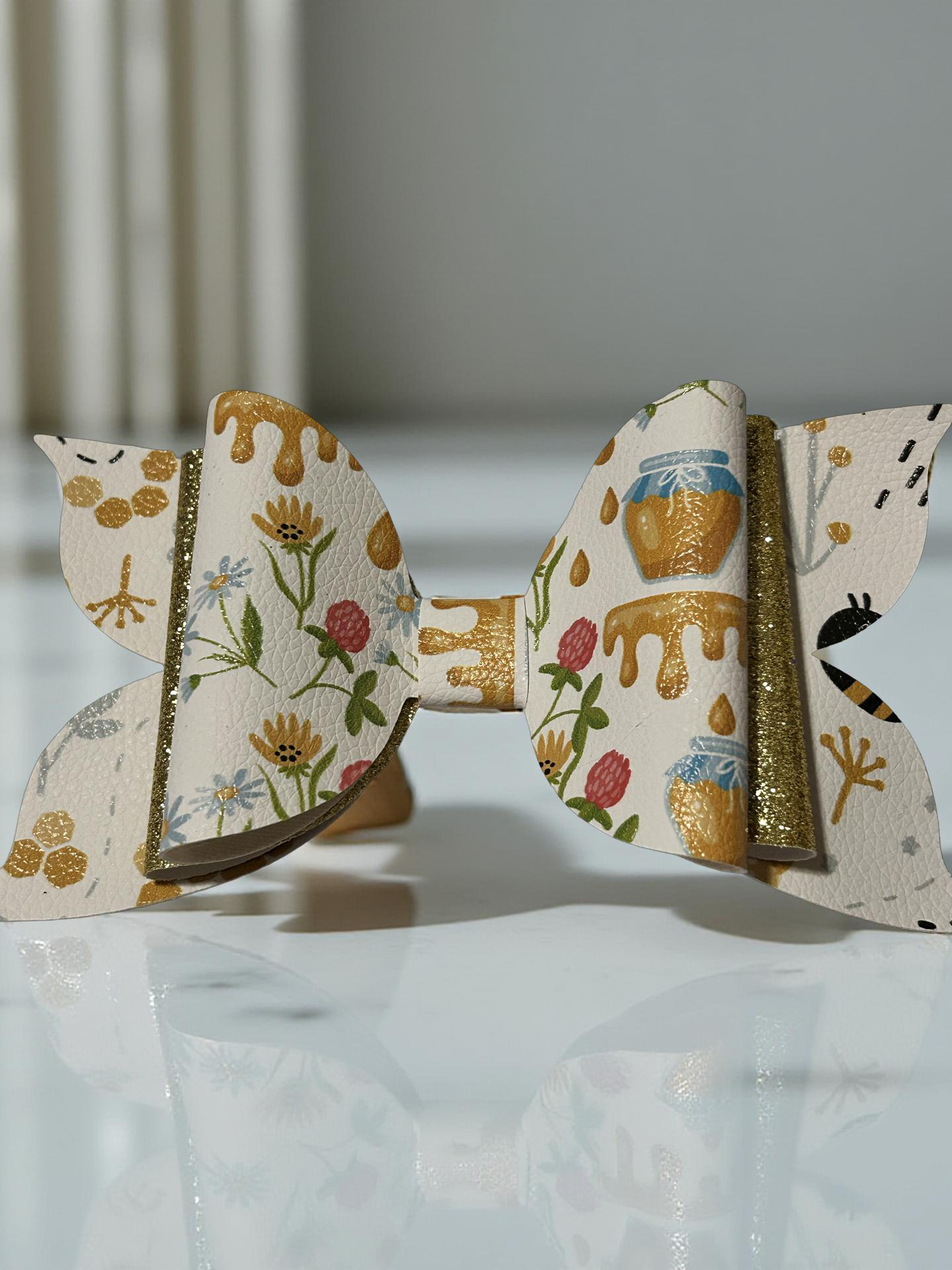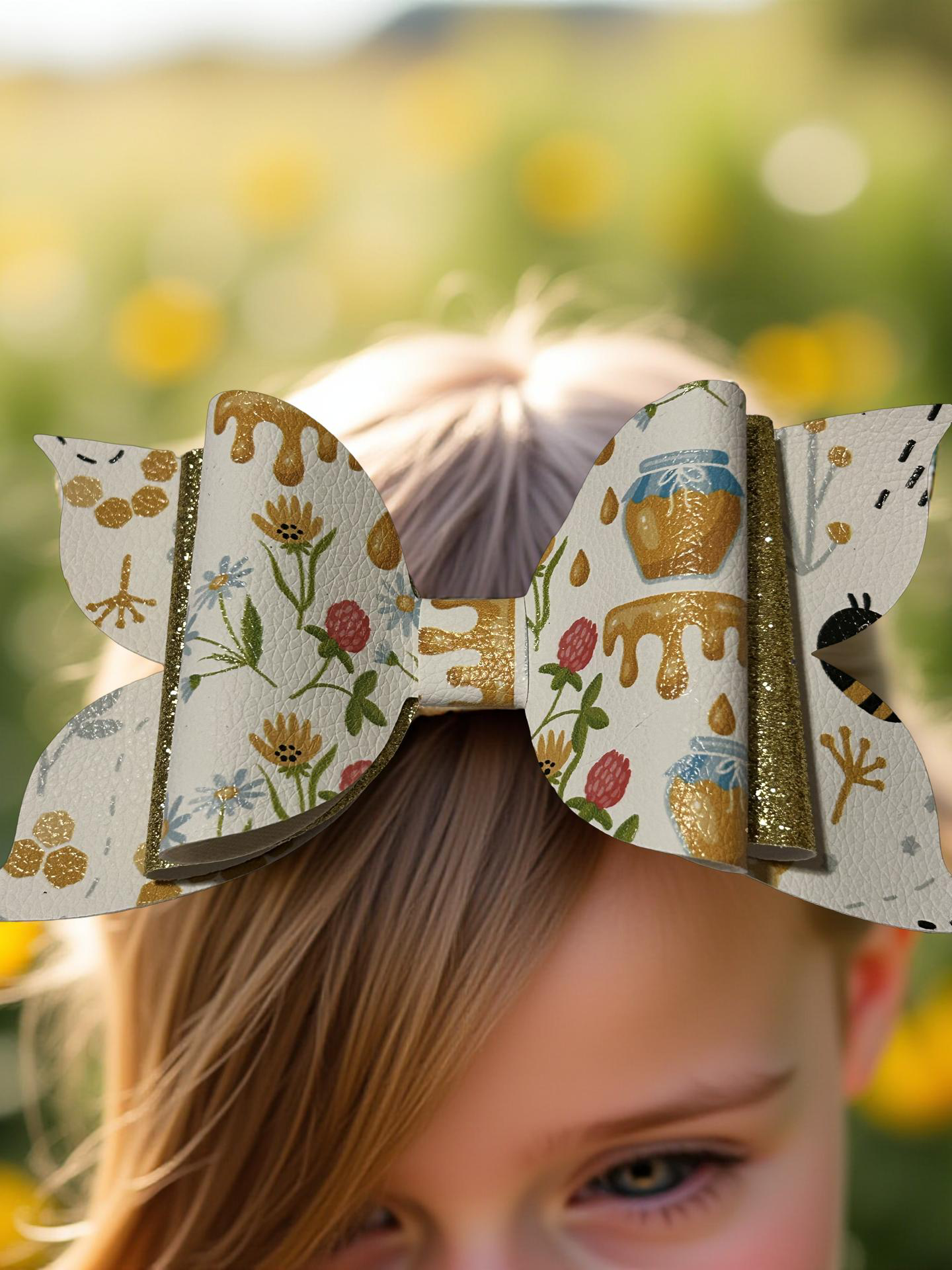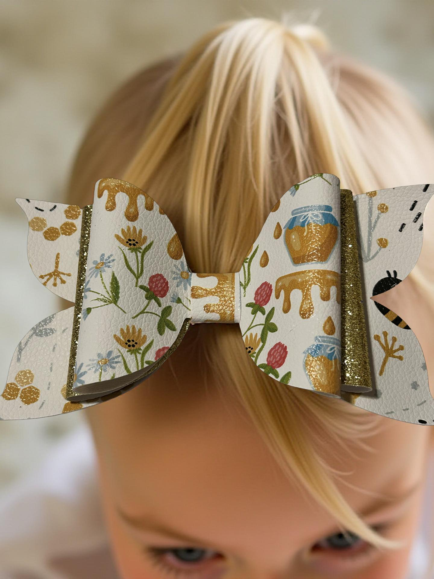 Dripping in golden charm and garden whimsy, this biggie bow features buzzing bees, honey jars, and glittery sweetness. A perfect pick for nature lovers and honey-hearted cuties!