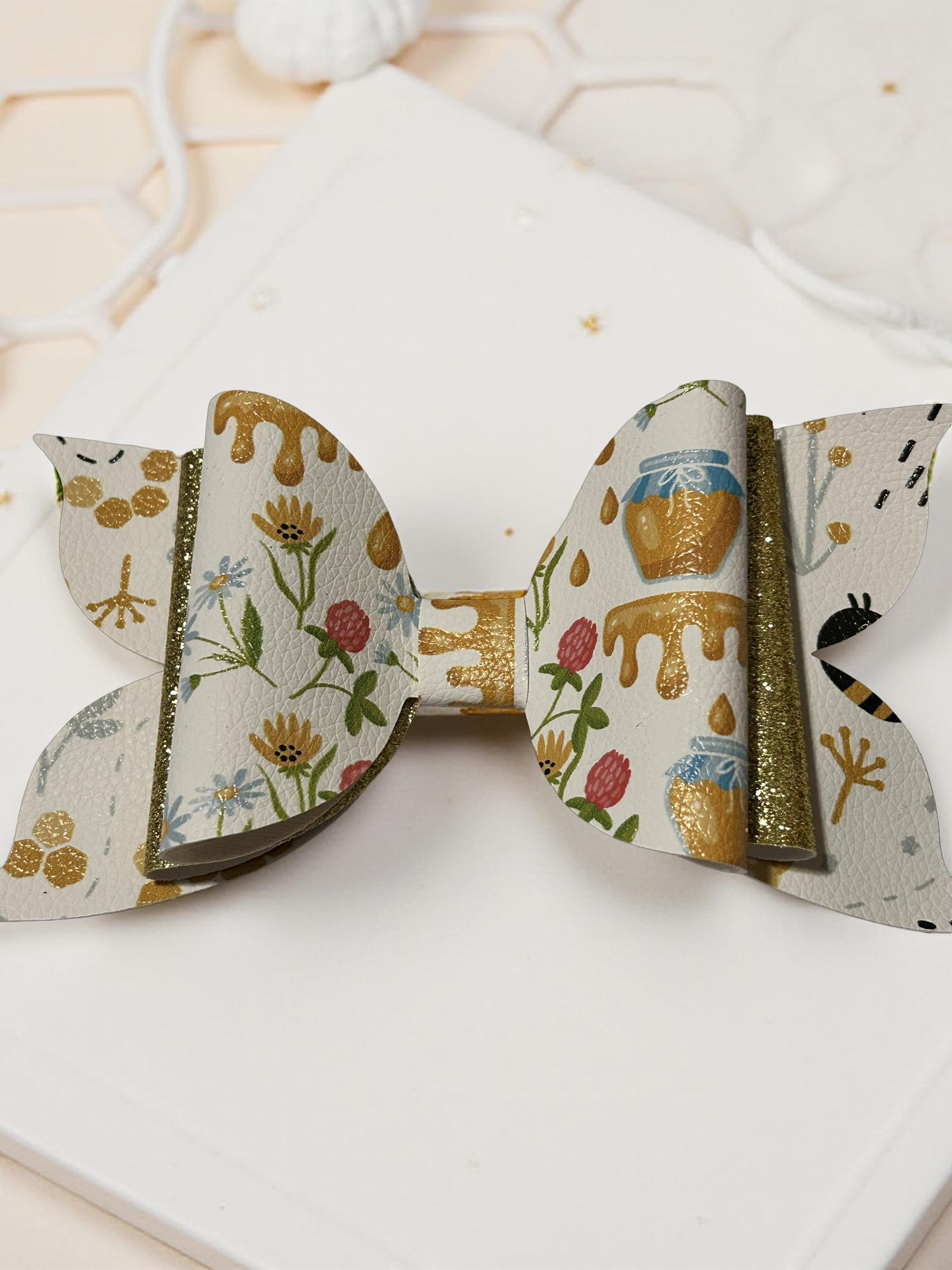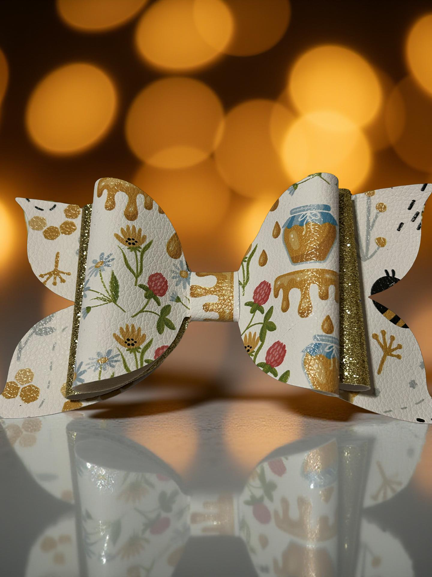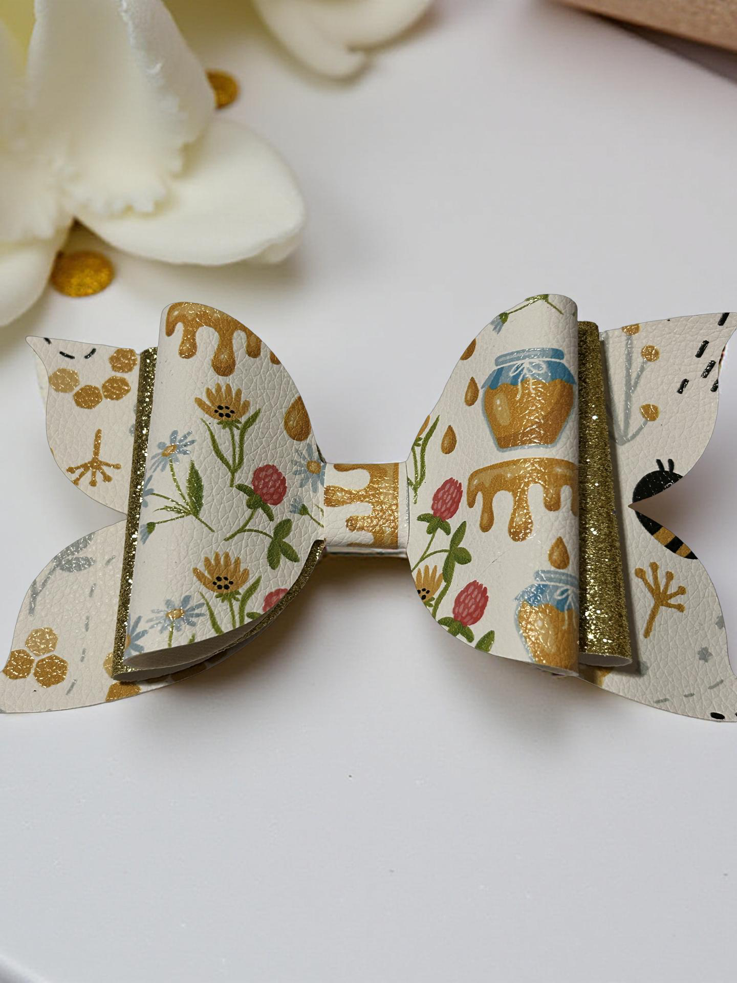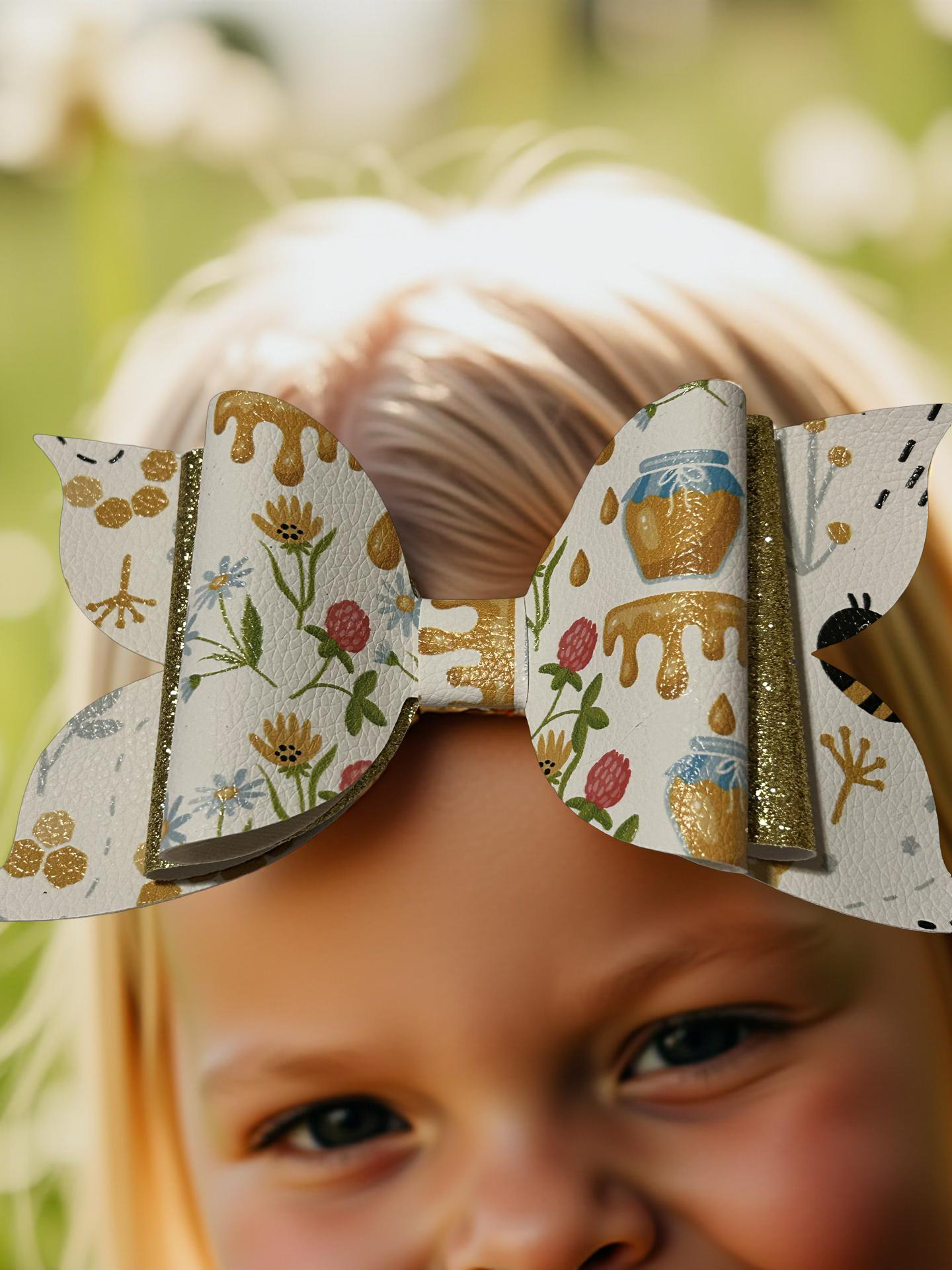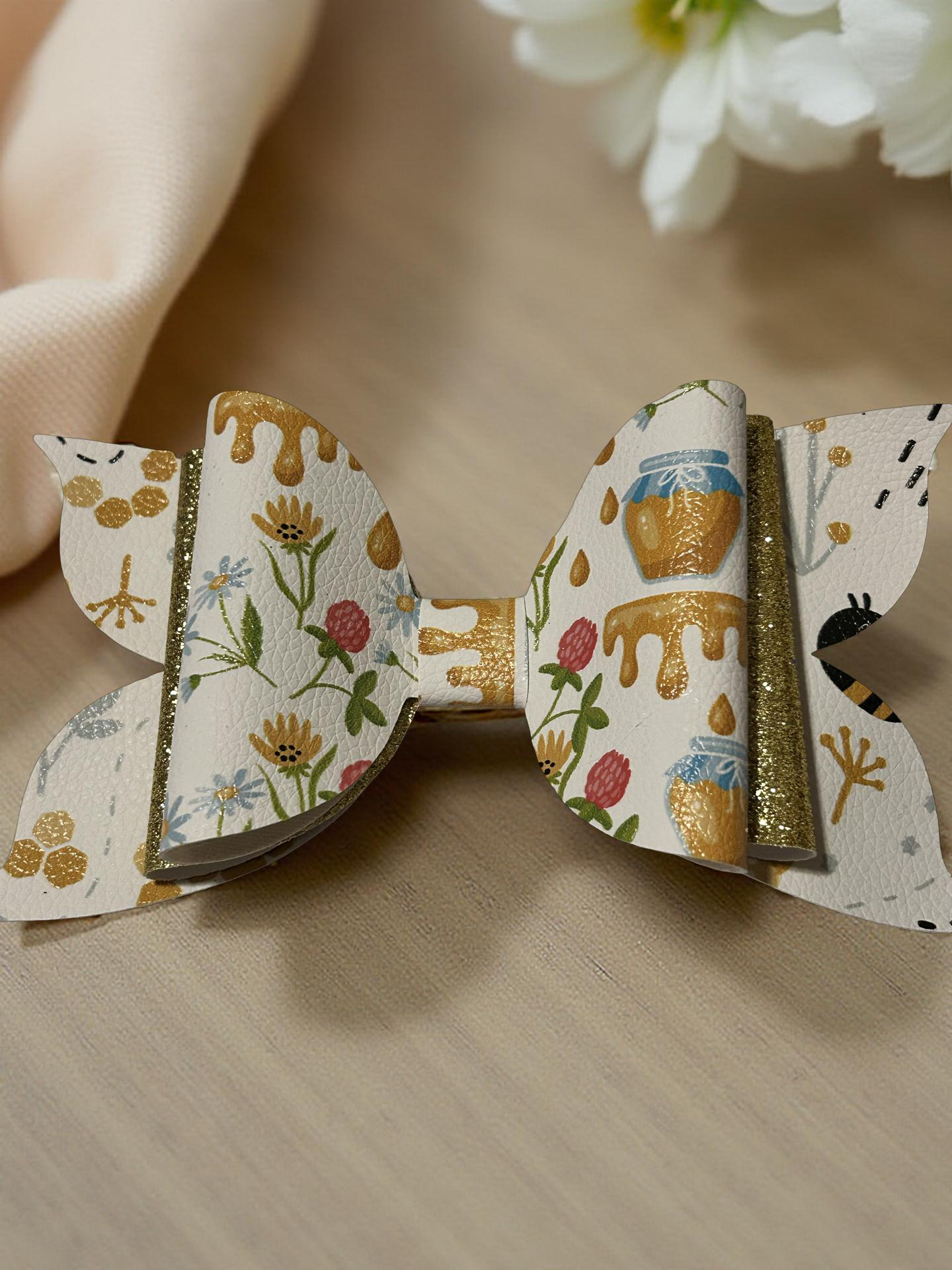 Dripping in golden charm and garden whimsy, this biggie bow features buzzing bees, honey jars, and glittery sweetness. A perfect pick for nature lovers and honey-hearted cuties!