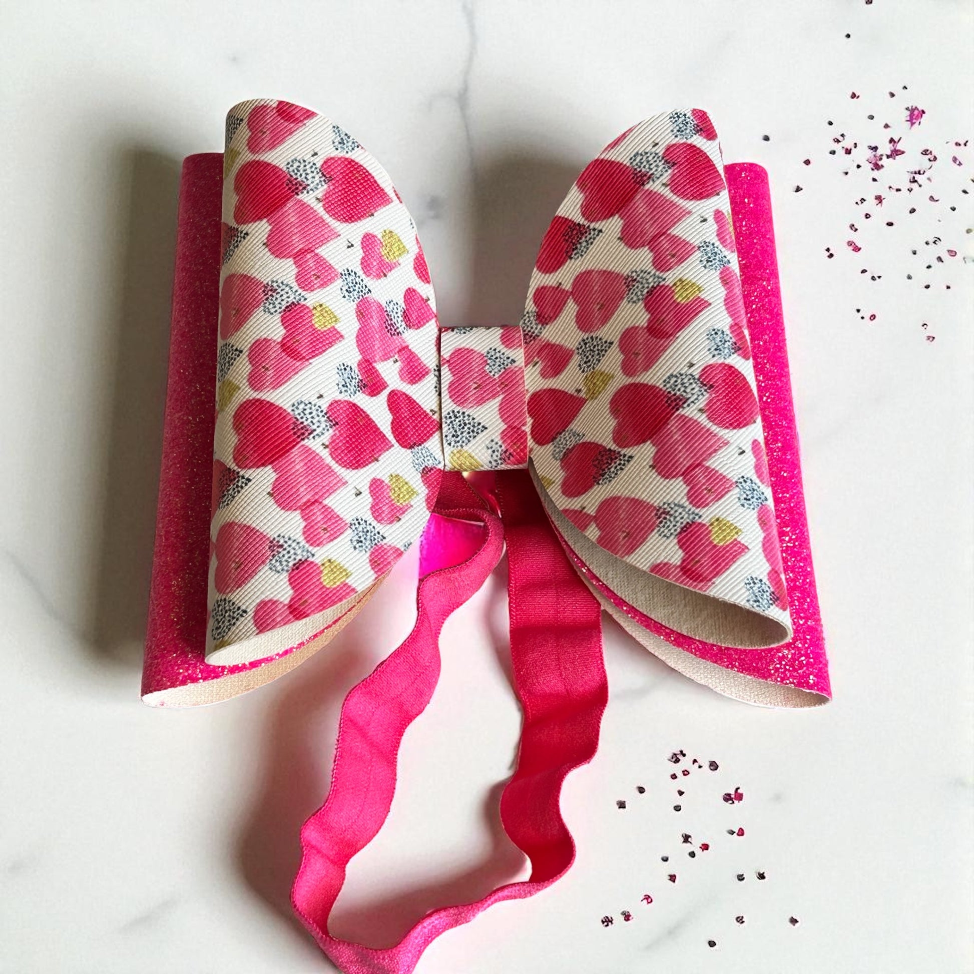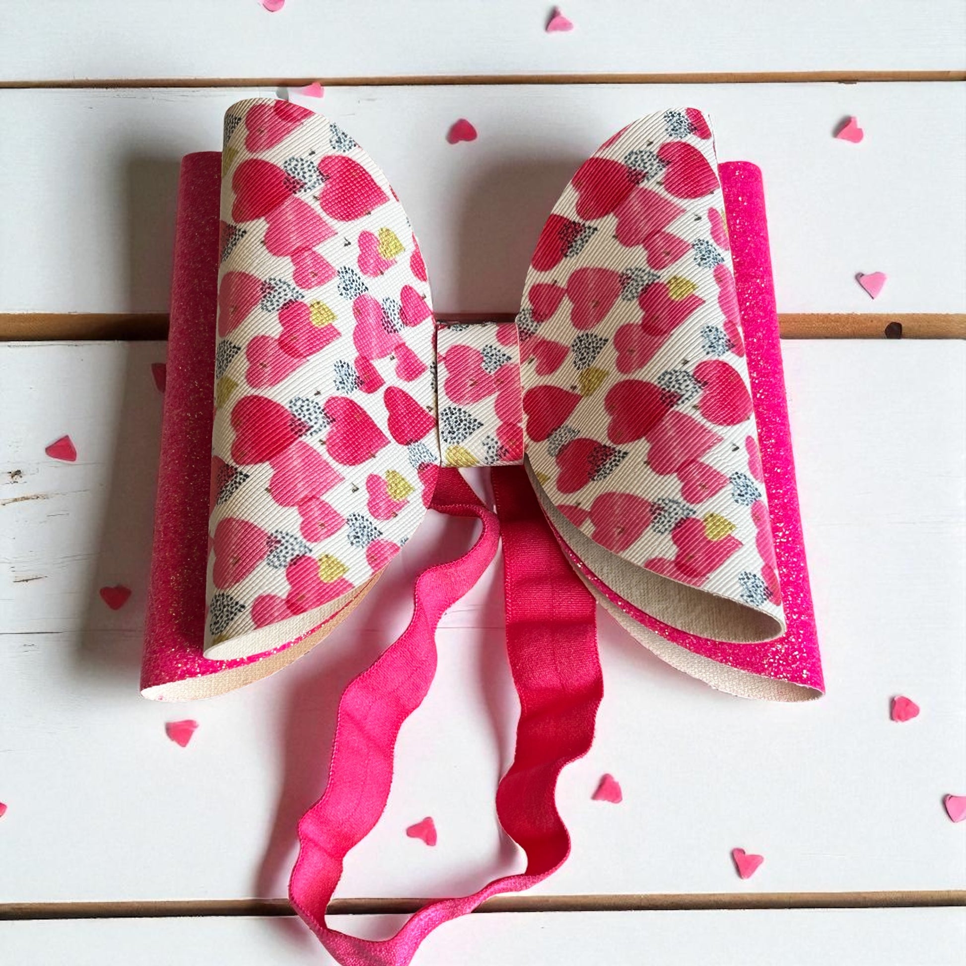 Covered in shades of pink, glittery sparkle, and tiny hearts, this bow brings all the Valentine vibes  no matter the season! The perfect pop of color for sweet smiles and sunny days. 🌸✨