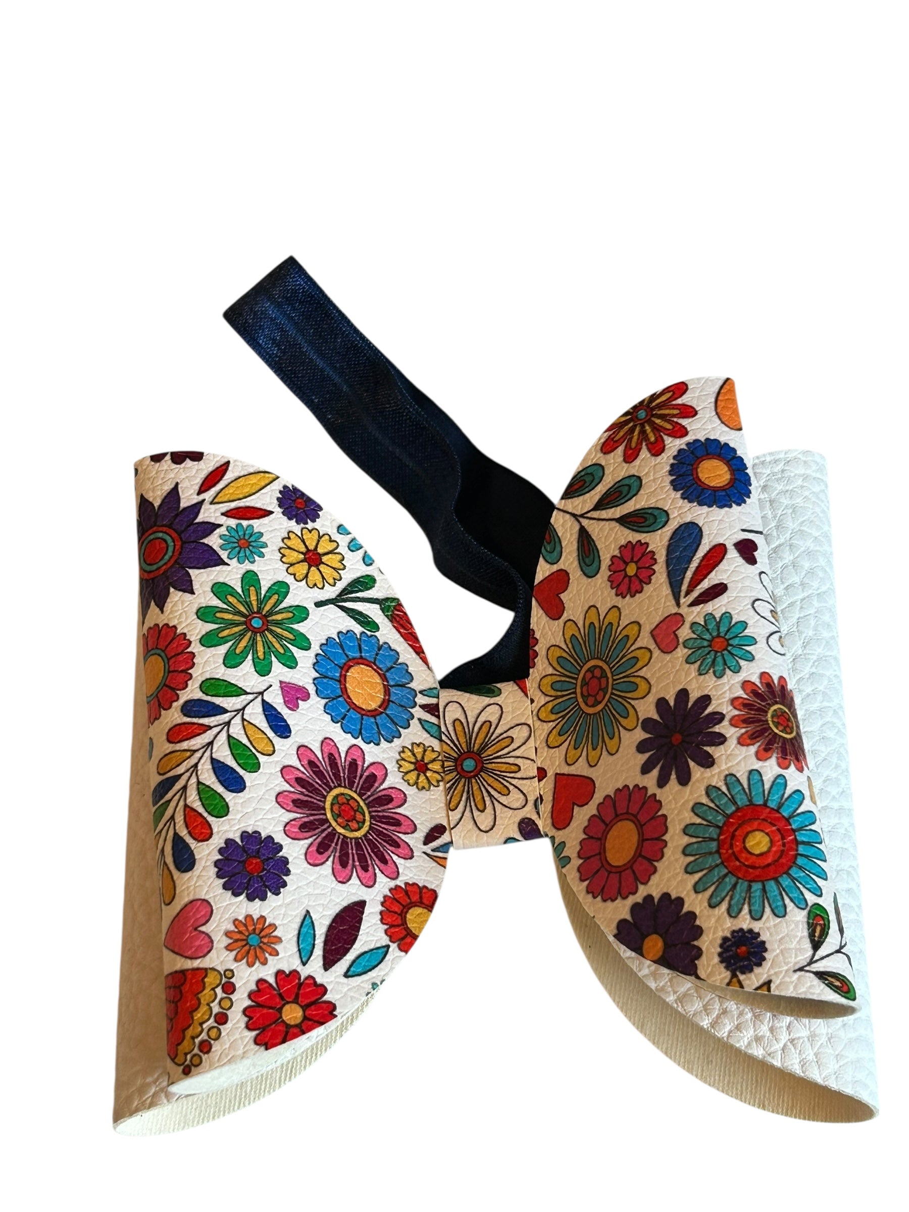 Bright, bold, and beautifully balanced! This bow showcases a vibrant floral pattern in every color of the rainbow, paired with deep blue ribbon tails for contrast. Whether worn for a celebration or a casual day out, the comfy band and cheerful design make it a go-to for flower lovers.
