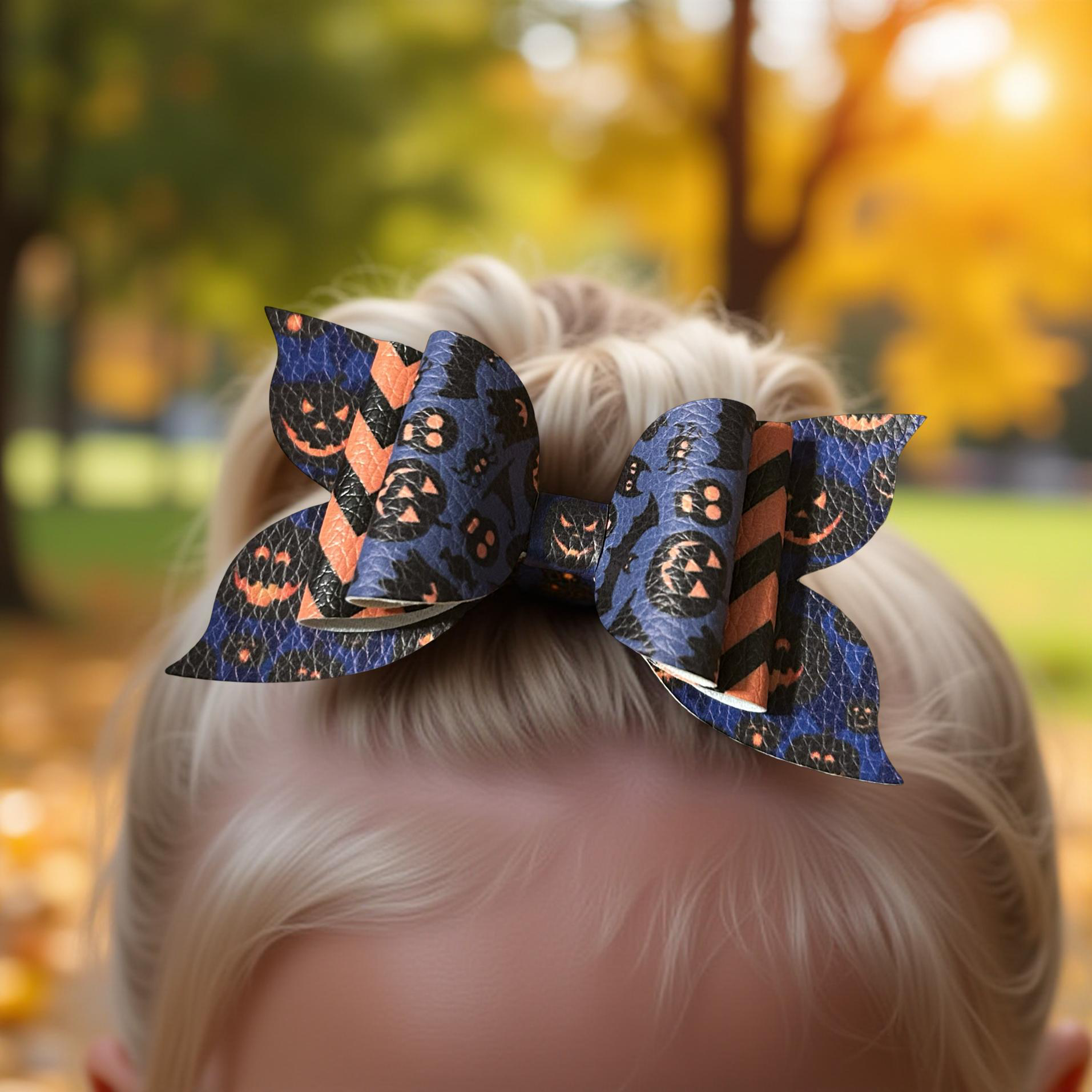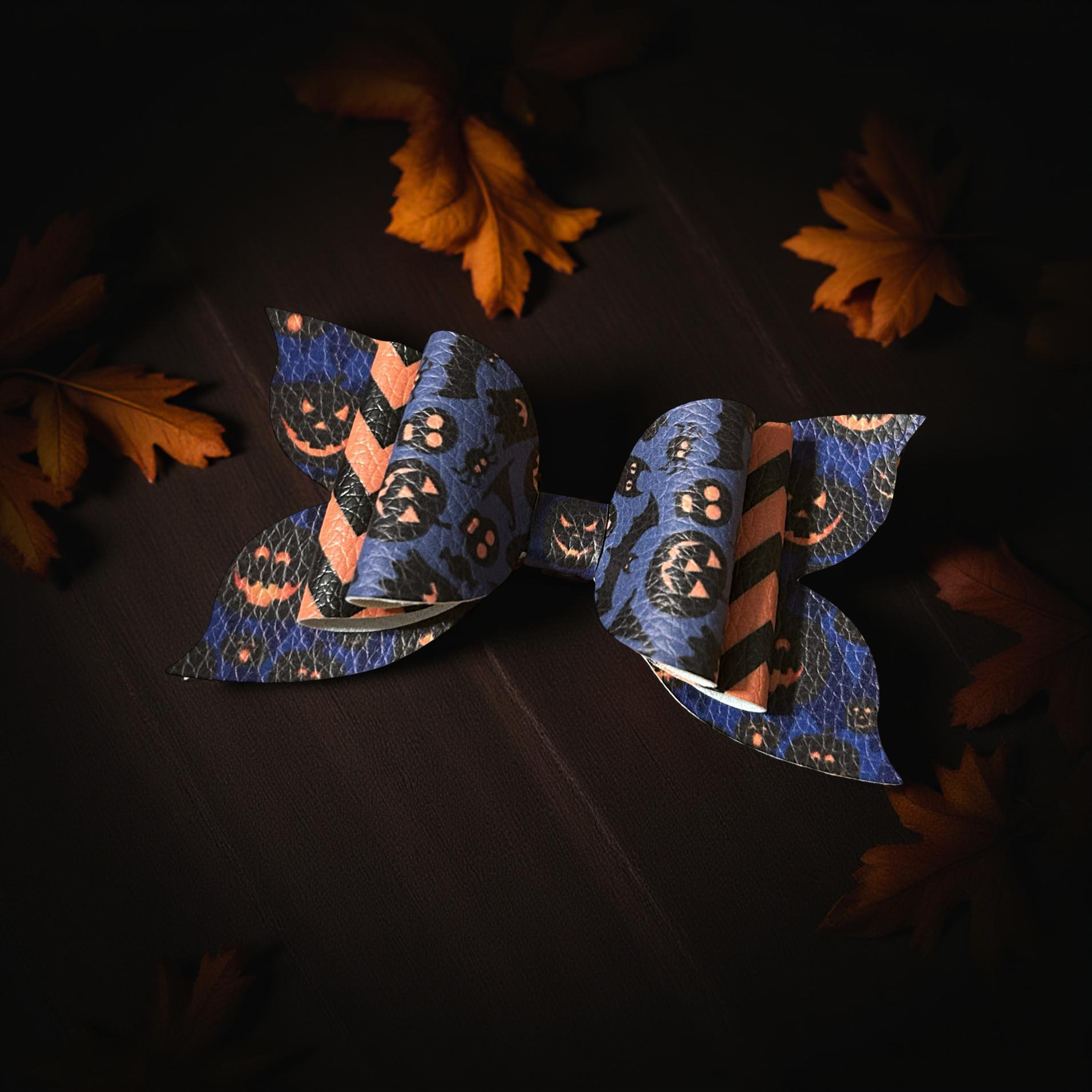 A frightfully fun favorite! This Halloween bow features bold jack-o’-lanterns, chevron stripes, and scalloped edges in deep midnight hues with pops of orange. It’s perfect for costume cuties, candy chasers, and anyone who loves a little spooky sparkle. Add it to your haunted haul and let the boo-tique magic begin!