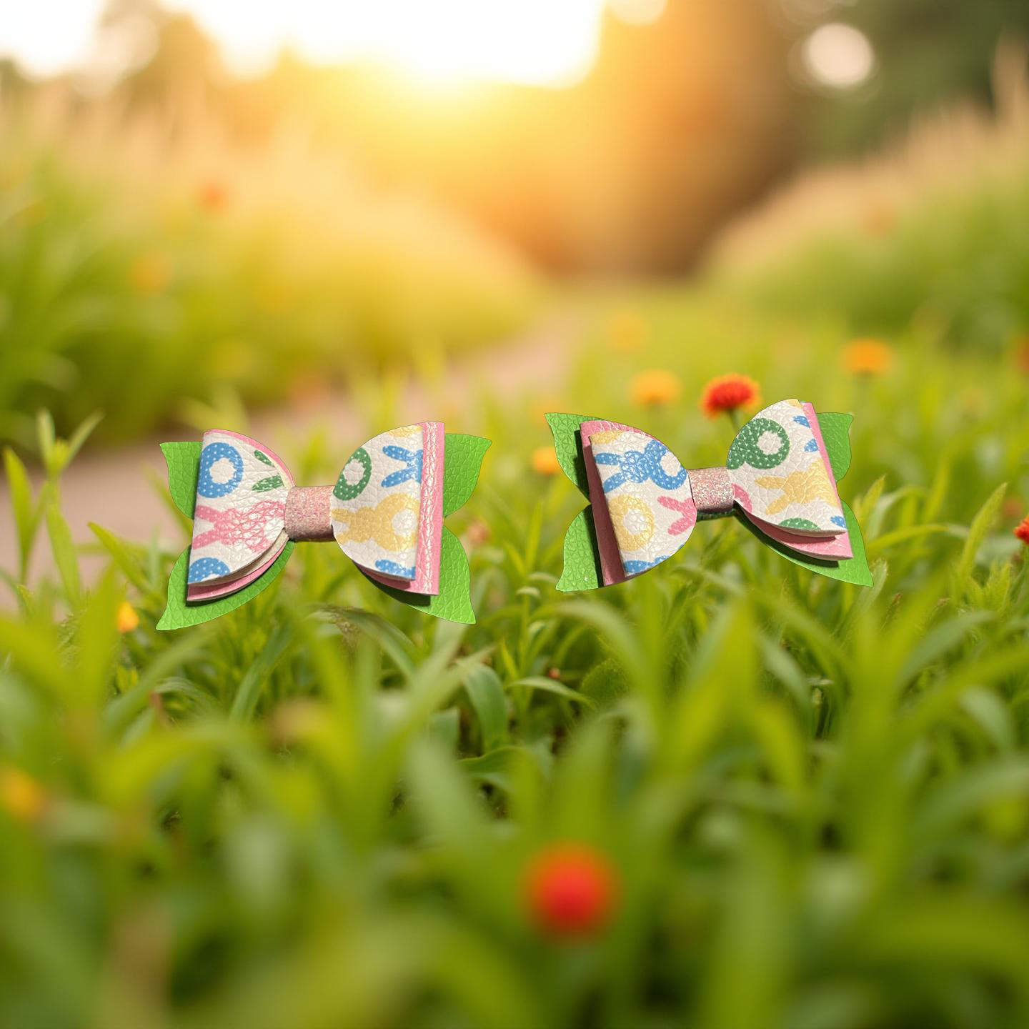 Hop into cuteness with our Bunny Hop! These bite-size bows are sprinkled with colorful bunnies and sweet spring vibes, finished with bright green and pink layers for extra charm.