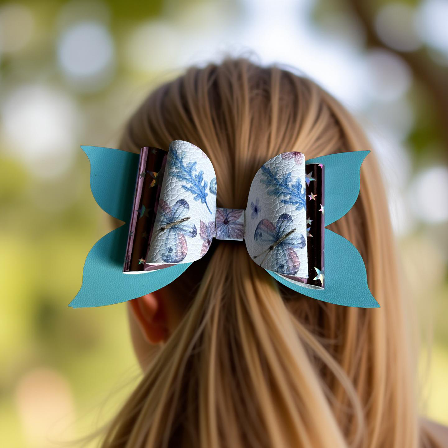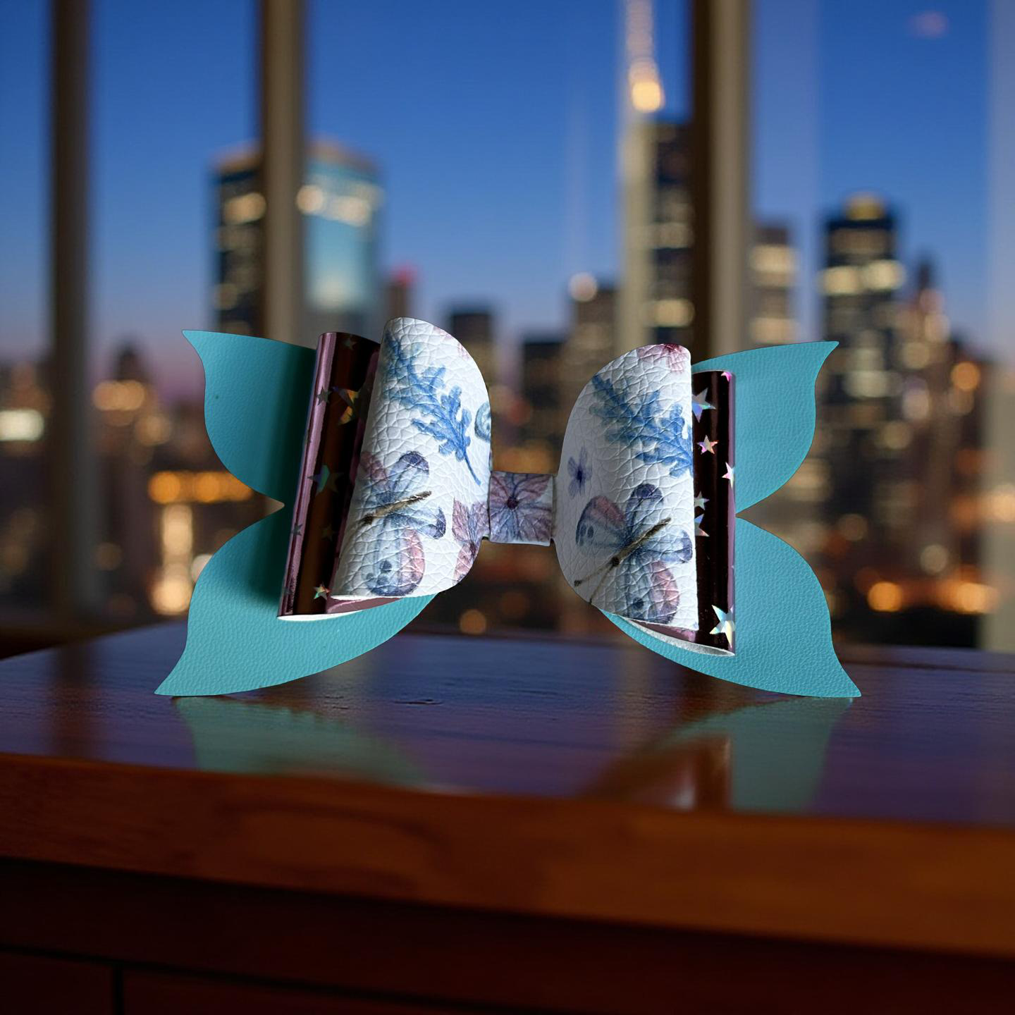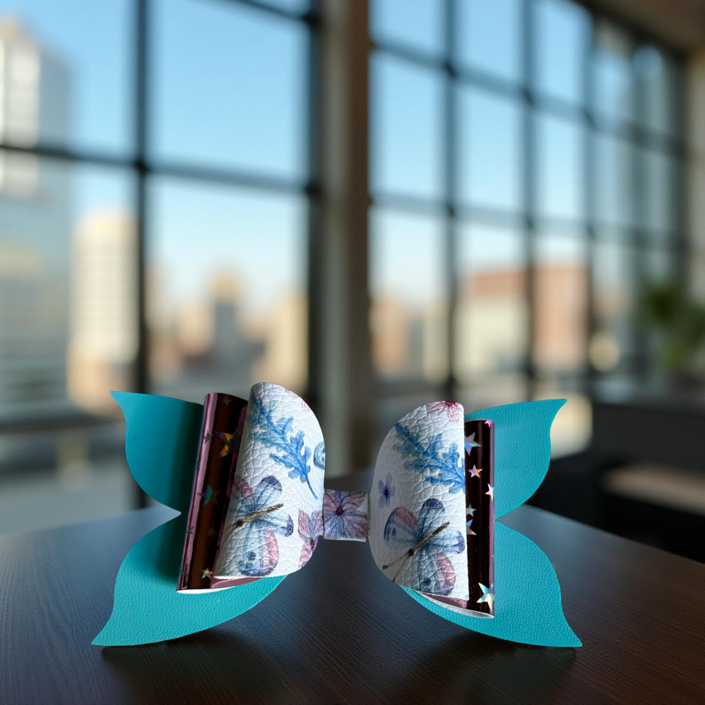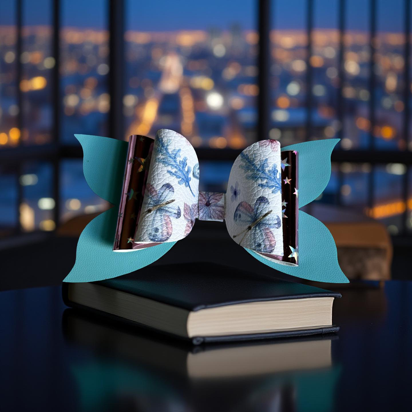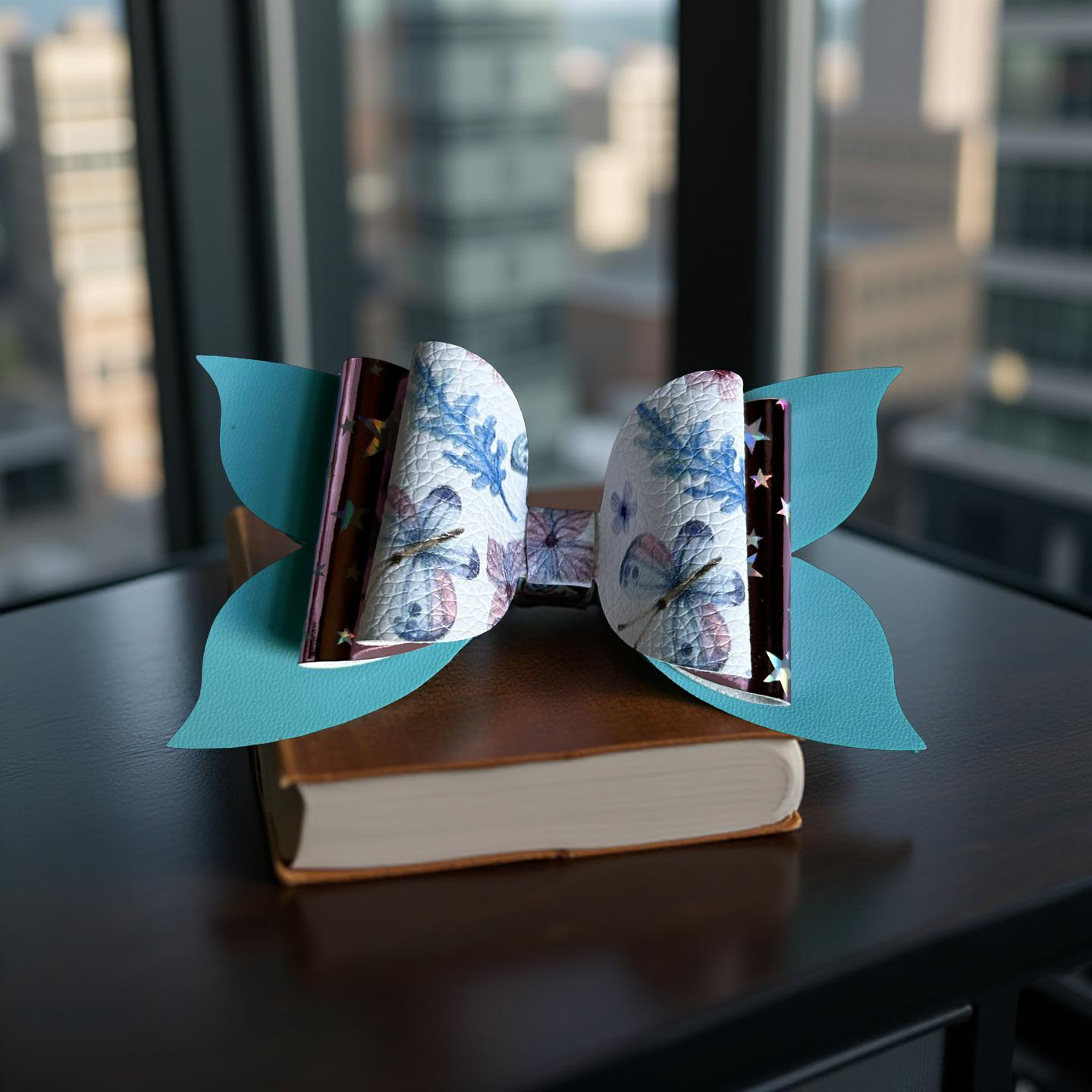 Float into fantasy with this dreamy bow, where butterflies and blossoms mingle in soft pastel hues. A double-looped print ribbon flutters atop a teal base shaped like wings or a mermaid tail, while a metallic pink strip with tiny stars adds a sprinkle of stardust. It’s a gentle breeze of color and charm—perfect for fairy-tale outfits, garden adventures, or adding a whisper of whimsy to your day