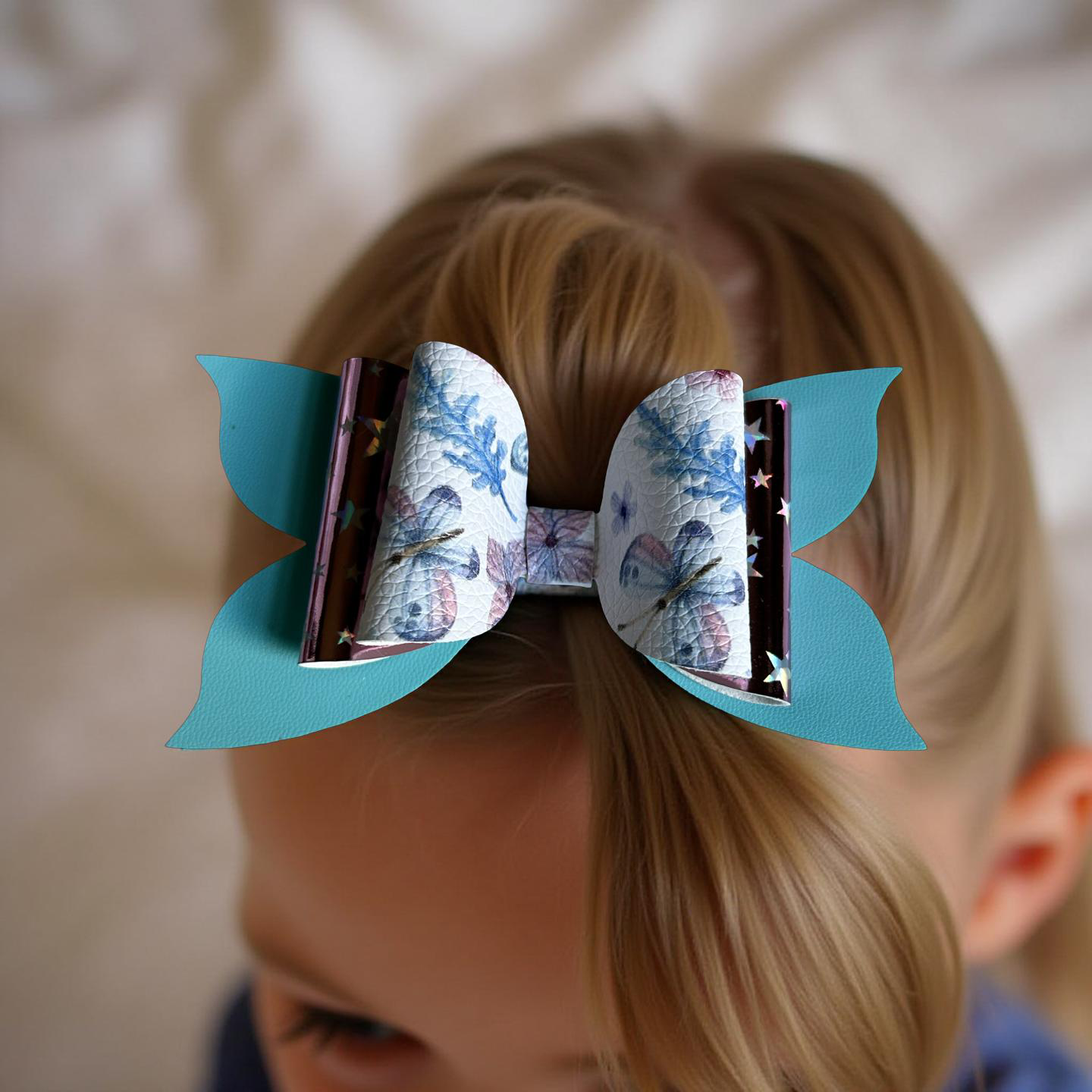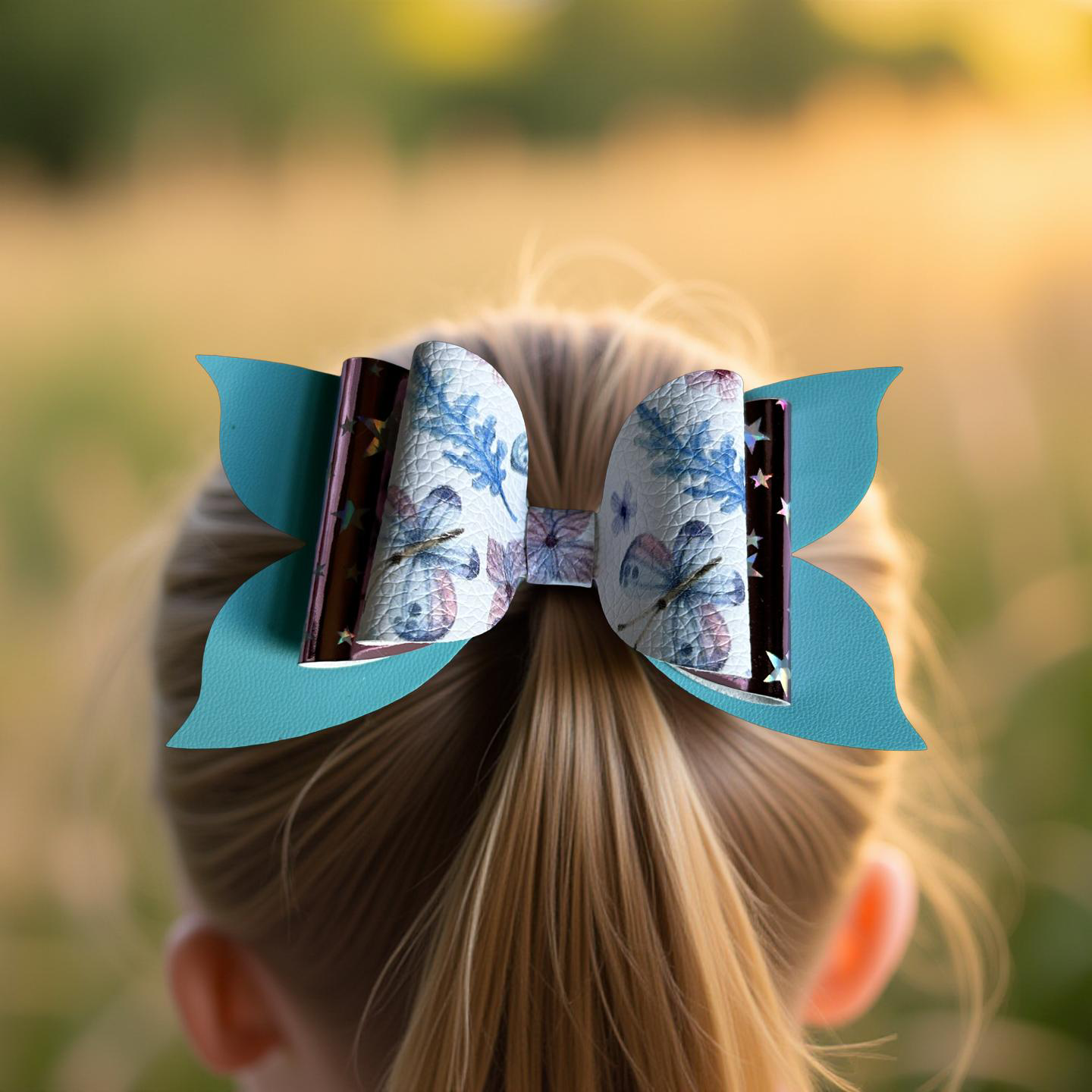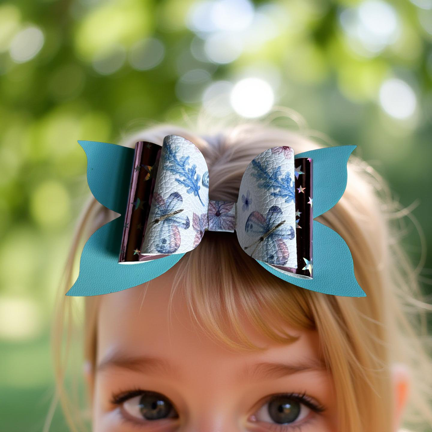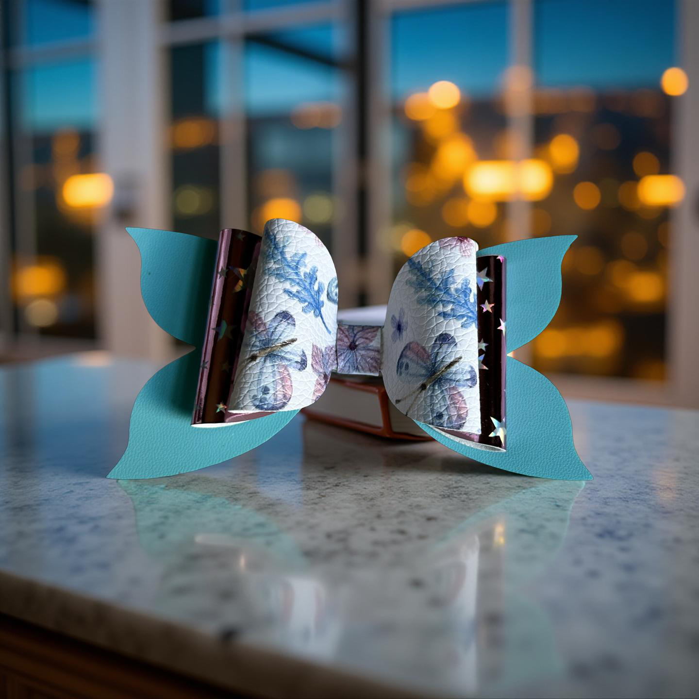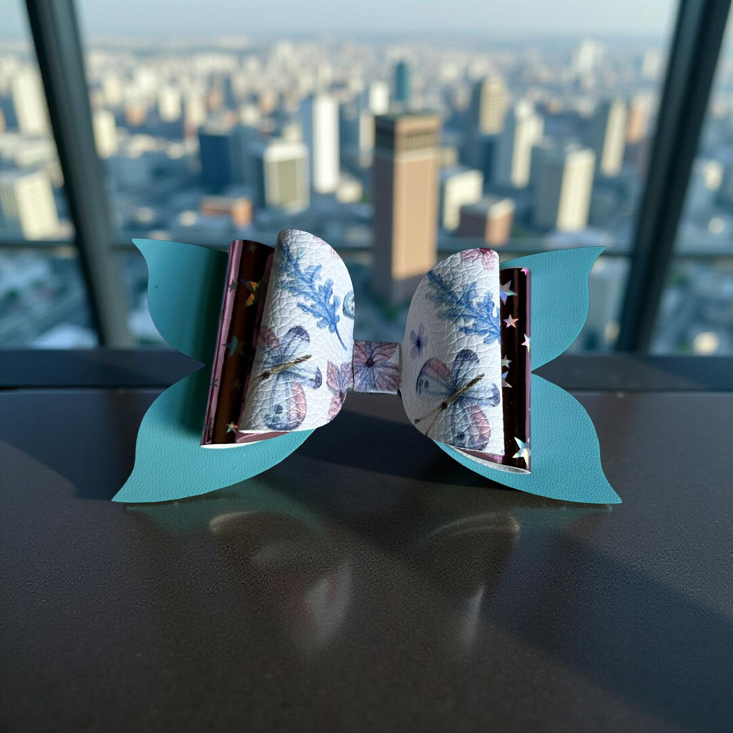 Float into fantasy with this dreamy bow, where butterflies and blossoms mingle in soft pastel hues. A double-looped print ribbon flutters atop a teal base shaped like wings or a mermaid tail, while a metallic pink strip with tiny stars adds a sprinkle of stardust. It’s a gentle breeze of color and charm—perfect for fairy-tale outfits, garden adventures, or adding a whisper of whimsy to your day