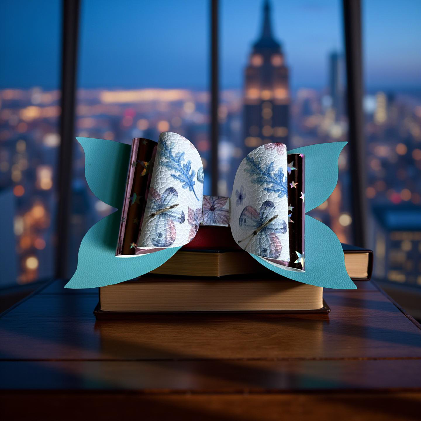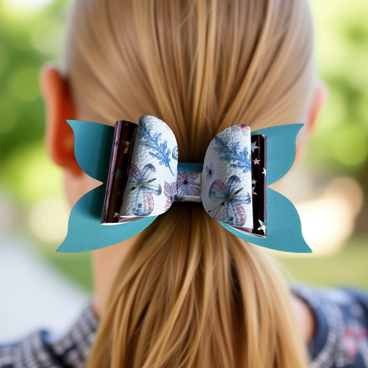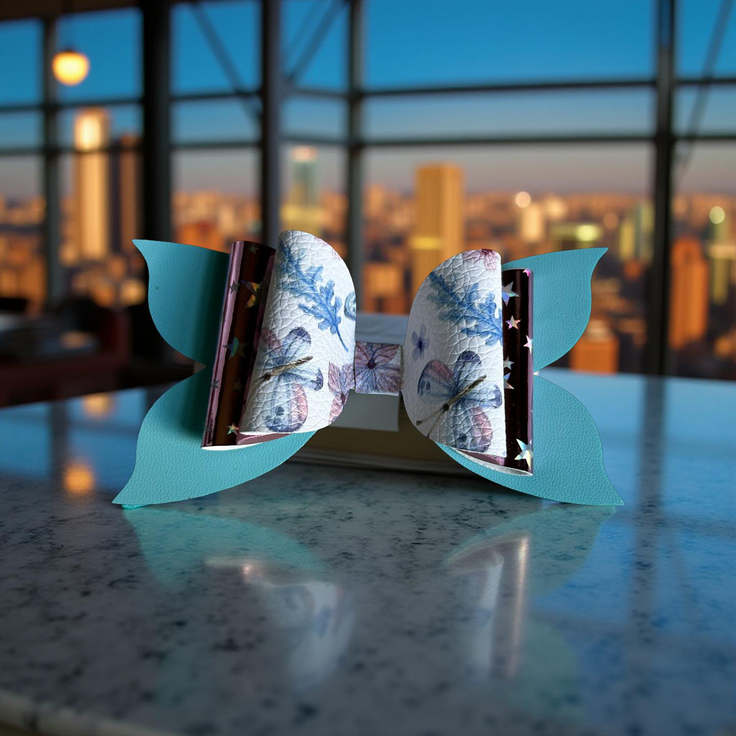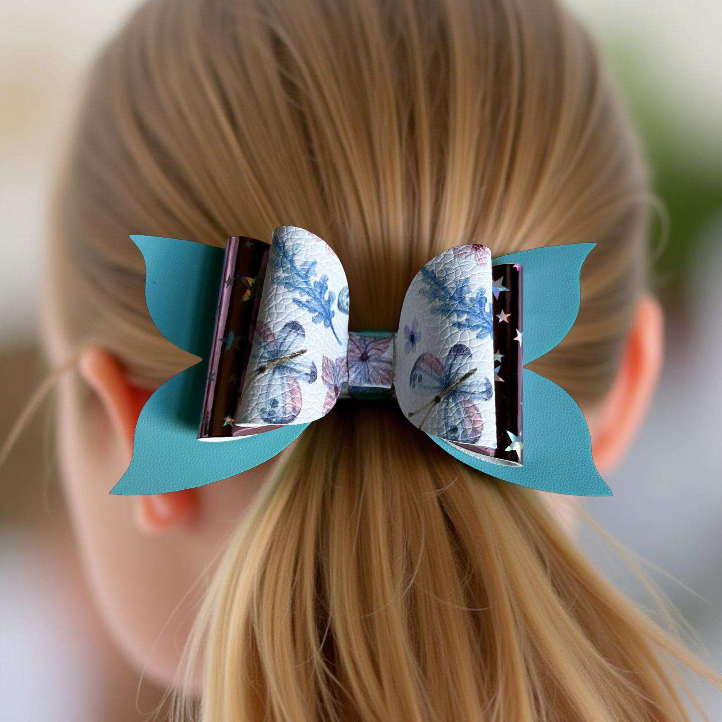 Float into fantasy with this dreamy bow, where butterflies and blossoms mingle in soft pastel hues. A double-looped print ribbon flutters atop a teal base shaped like wings or a mermaid tail, while a metallic pink strip with tiny stars adds a sprinkle of stardust. It’s a gentle breeze of color and charm—perfect for fairy-tale outfits, garden adventures, or adding a whisper of whimsy to your day