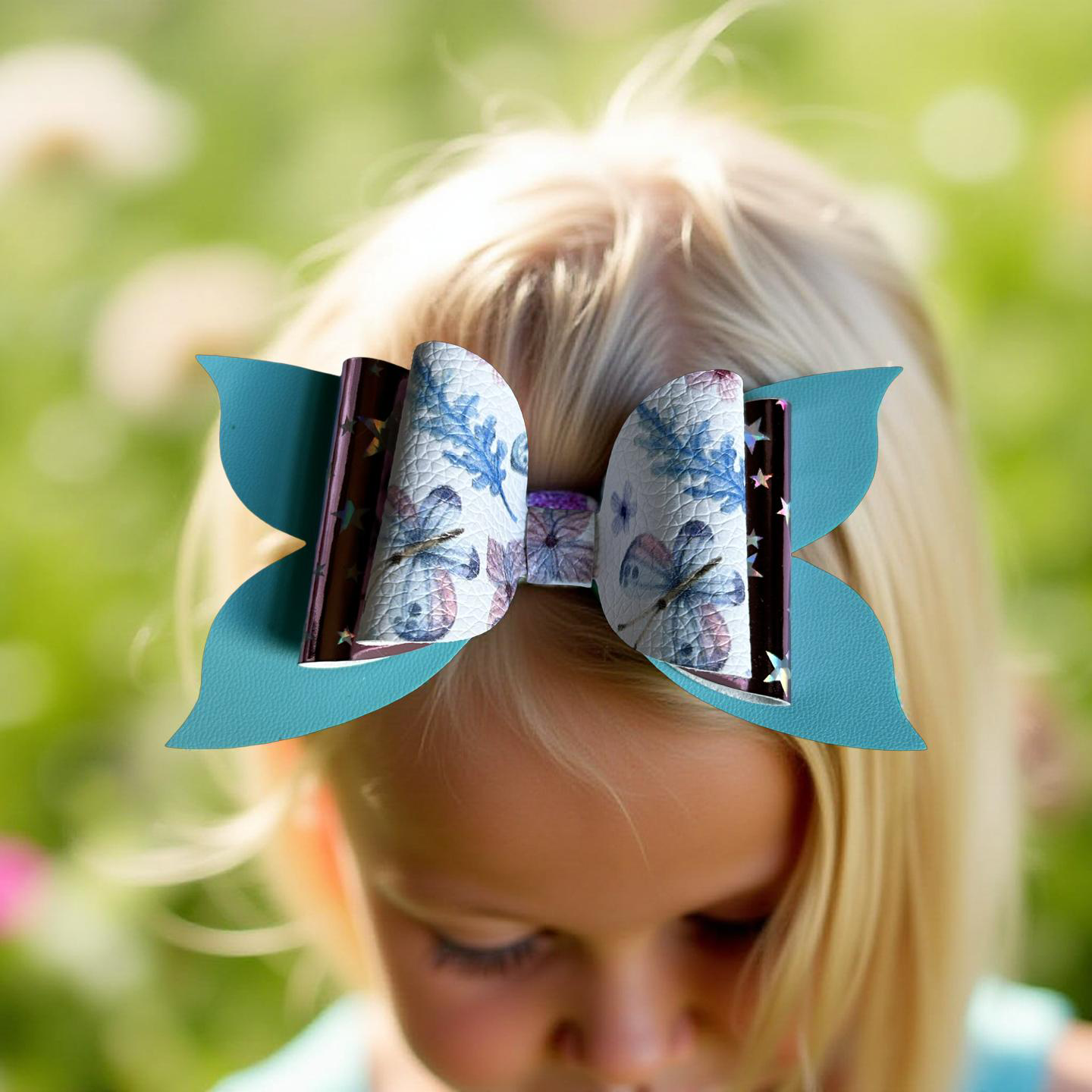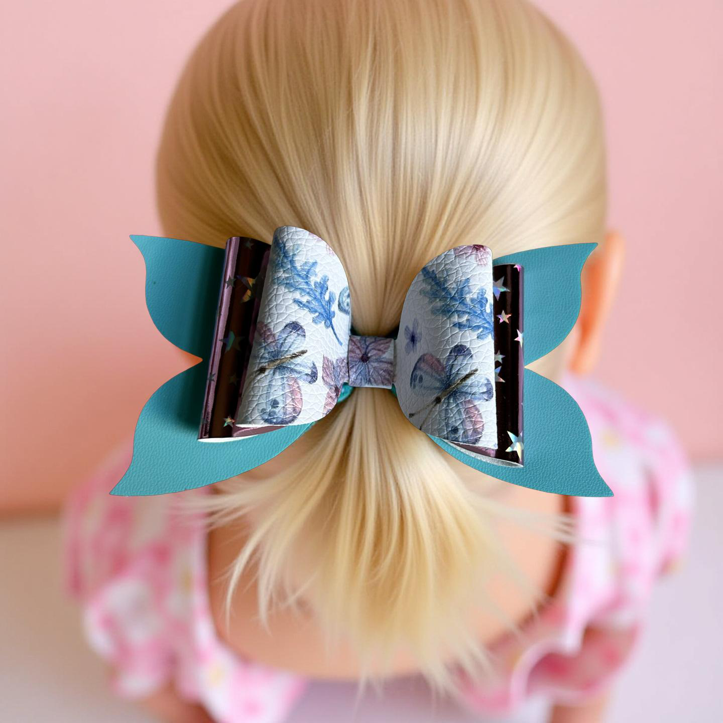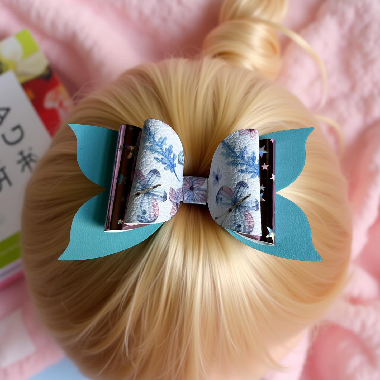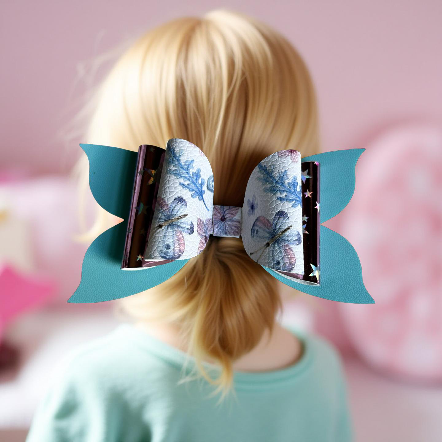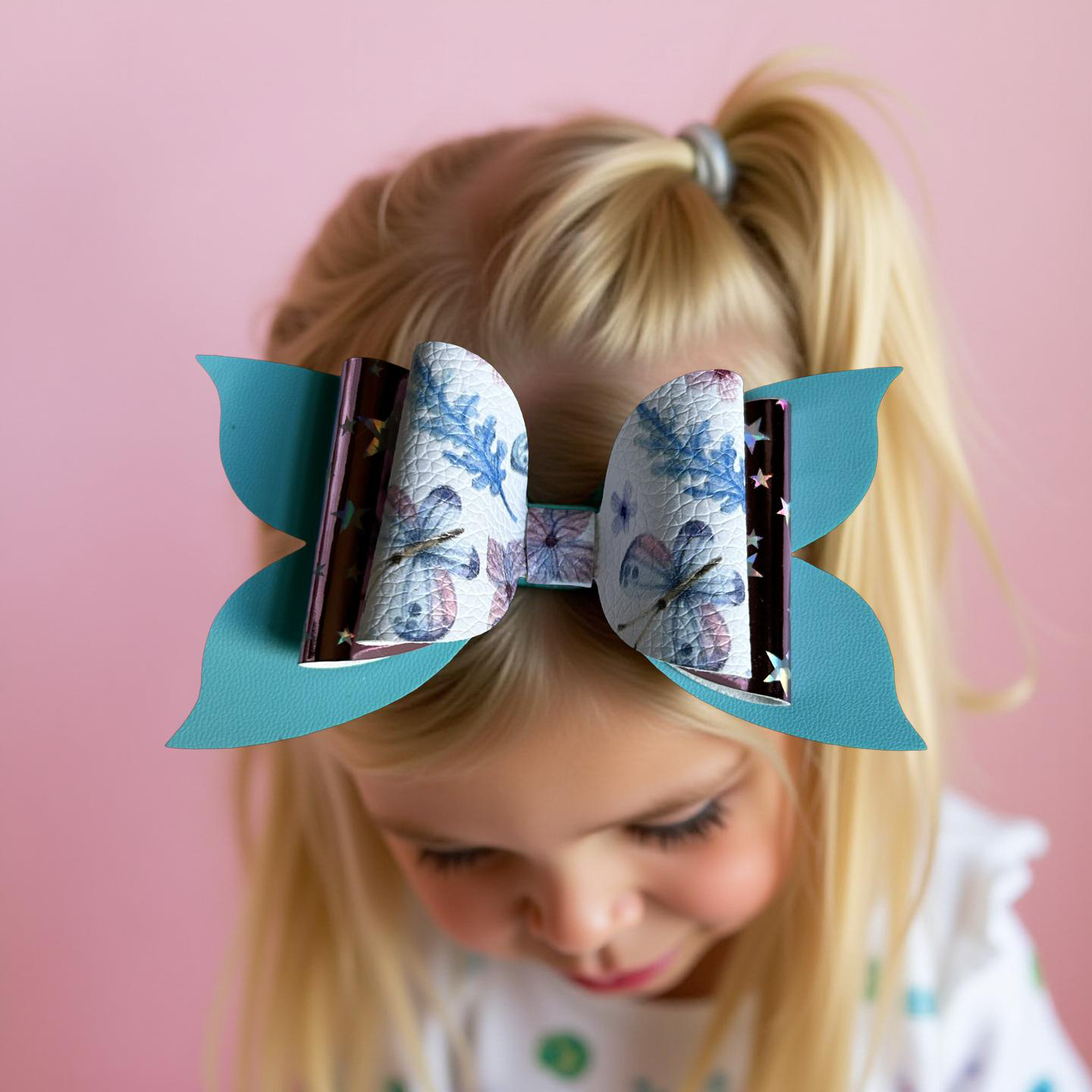 Float into fantasy with this dreamy bow, where butterflies and blossoms mingle in soft pastel hues. A double-looped print ribbon flutters atop a teal base shaped like wings or a mermaid tail, while a metallic pink strip with tiny stars adds a sprinkle of stardust. It’s a gentle breeze of color and charm—perfect for fairy-tale outfits, garden adventures, or adding a whisper of whimsy to your day
