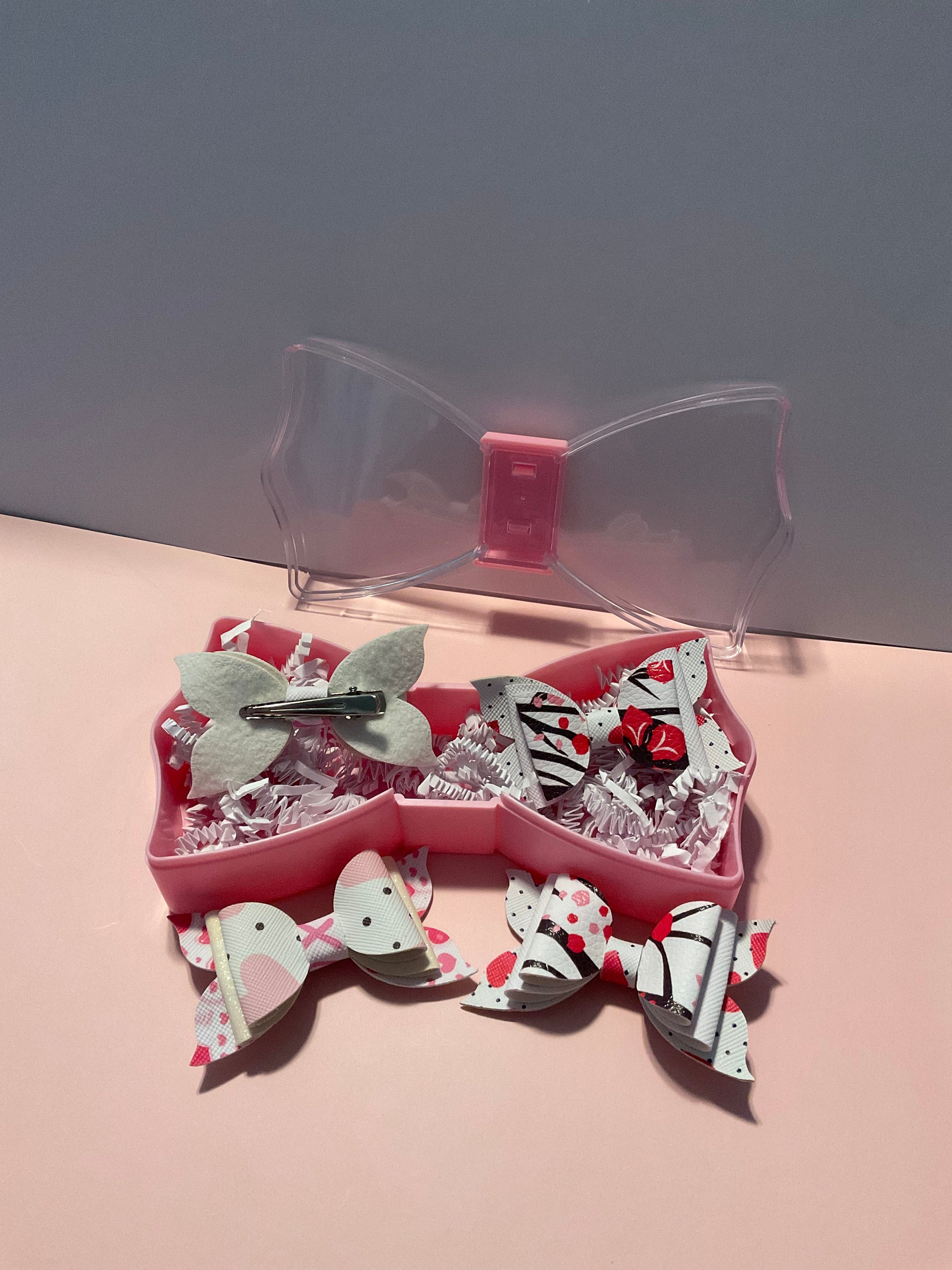 Sweet, soft, and full of charm Cherry Kiss brings together two pairs of bite‑size bows tucked inside a pink bow‑shaped case for the perfect gift‑ready moment.