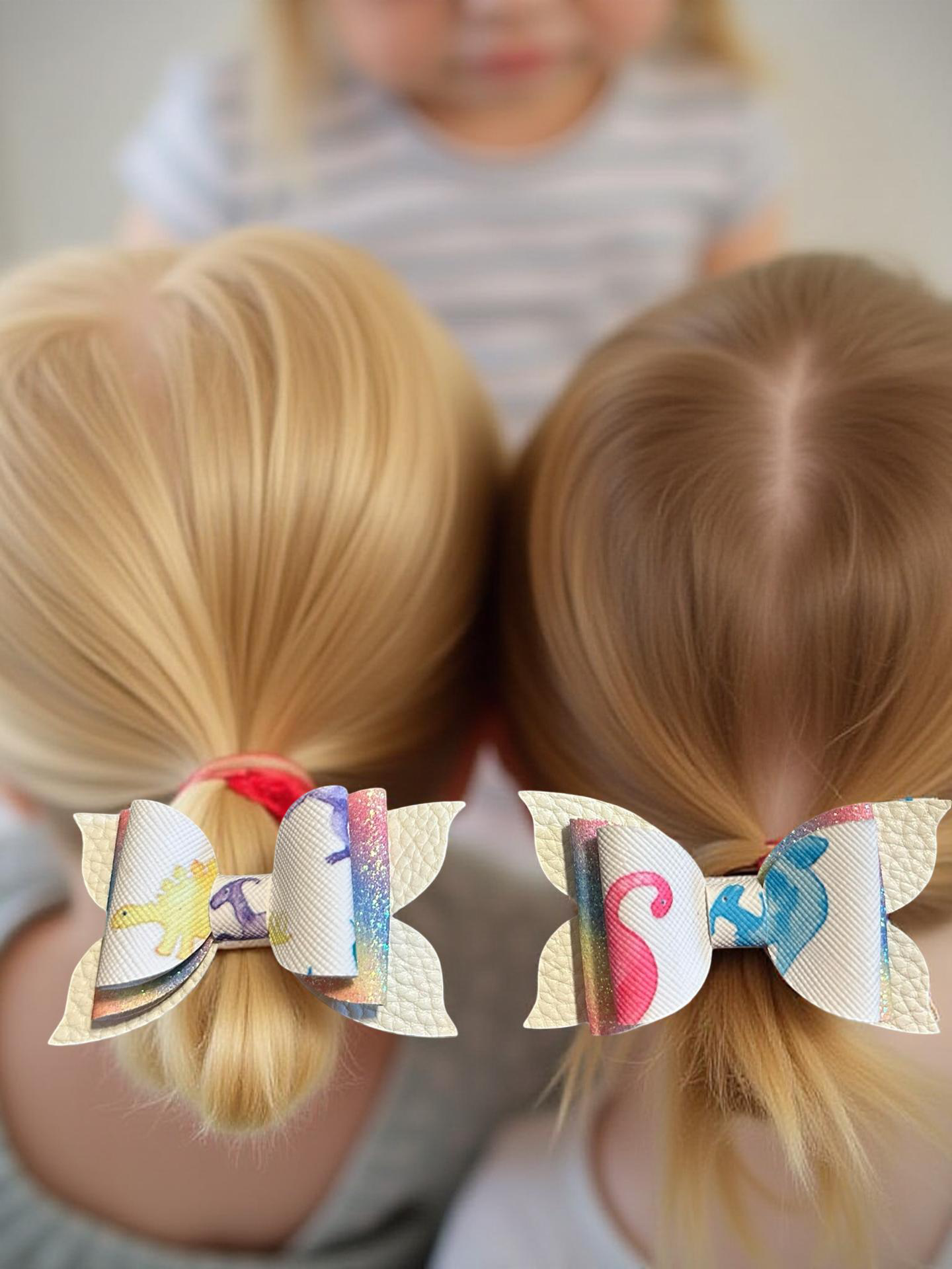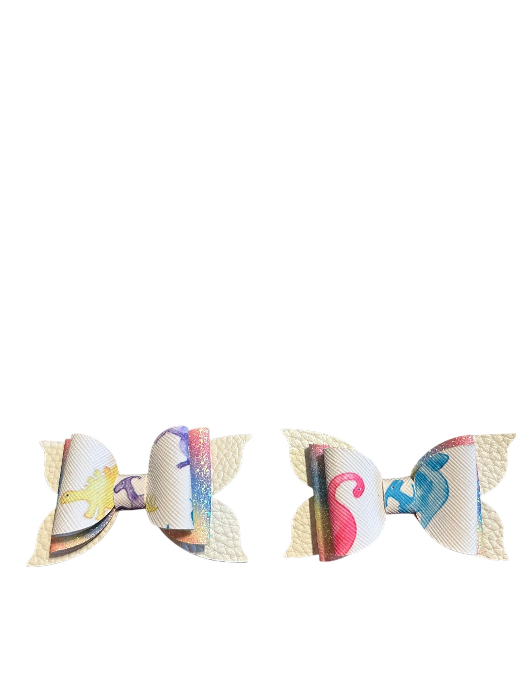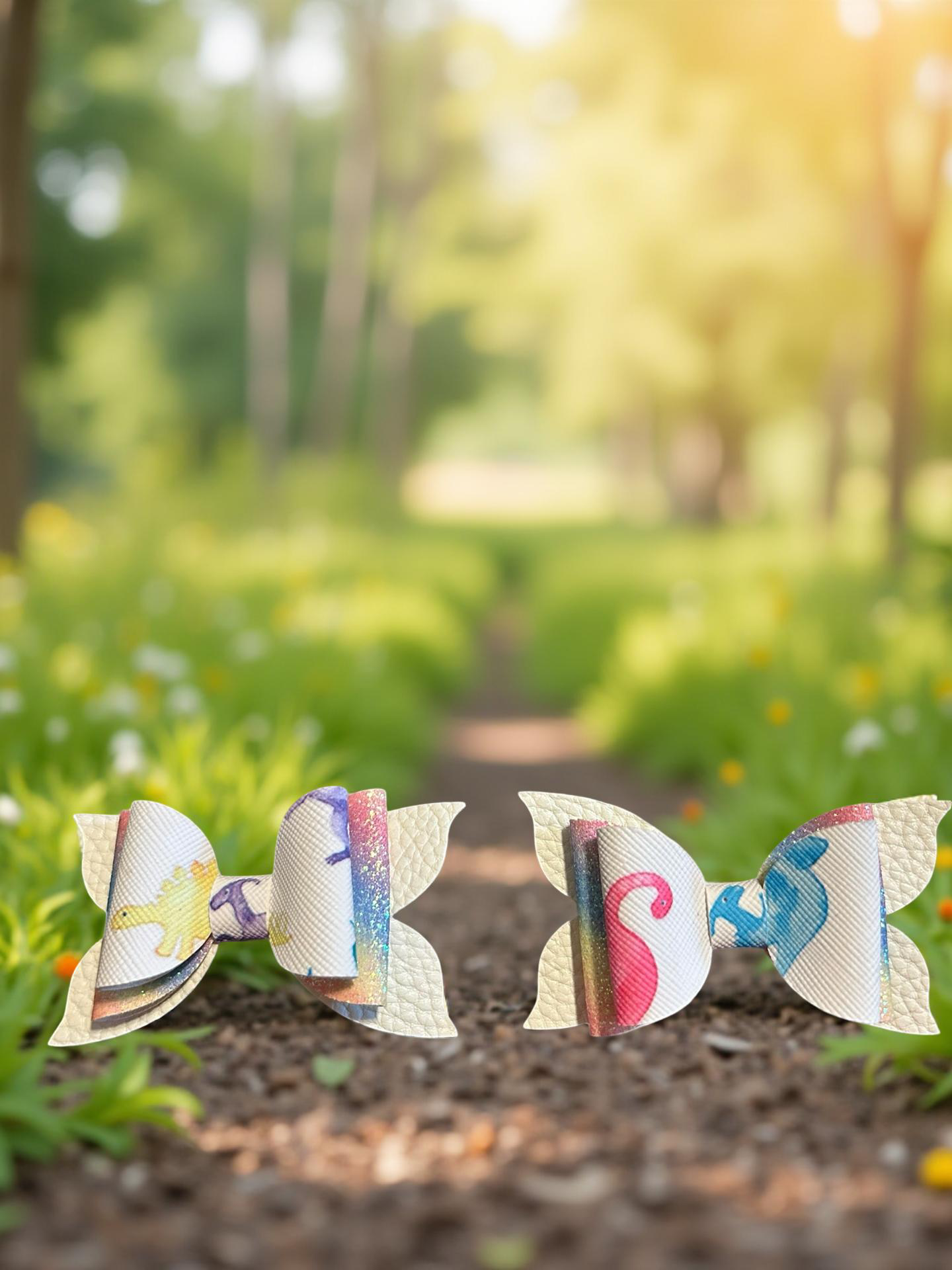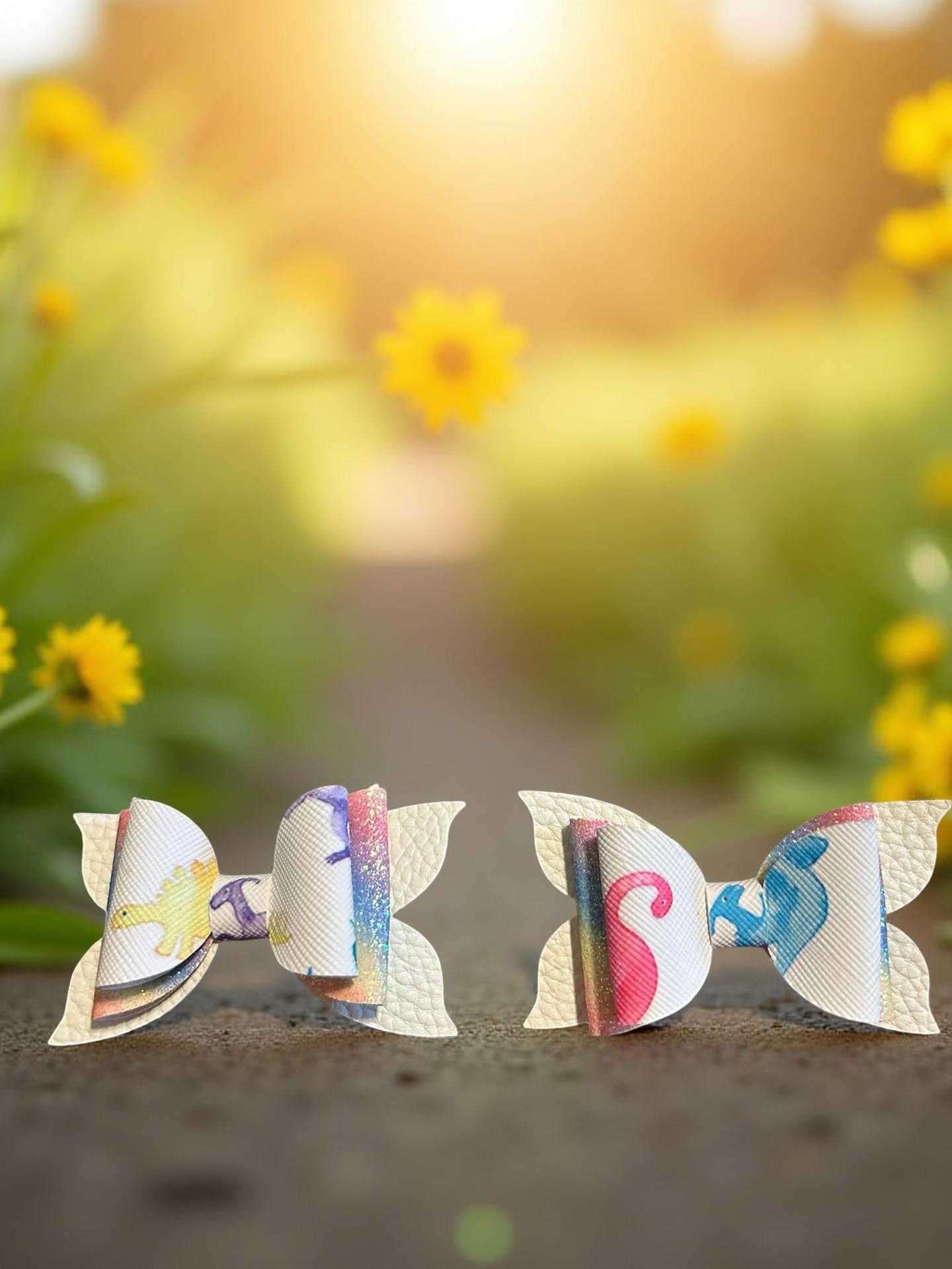 These playful bite-size bows are dino-mite! Featuring colorful dinosaurs with a touch of shimmer, this pair adds a pop of fun to any outfit. Perfect for little adventurers and dino-lovers alike!