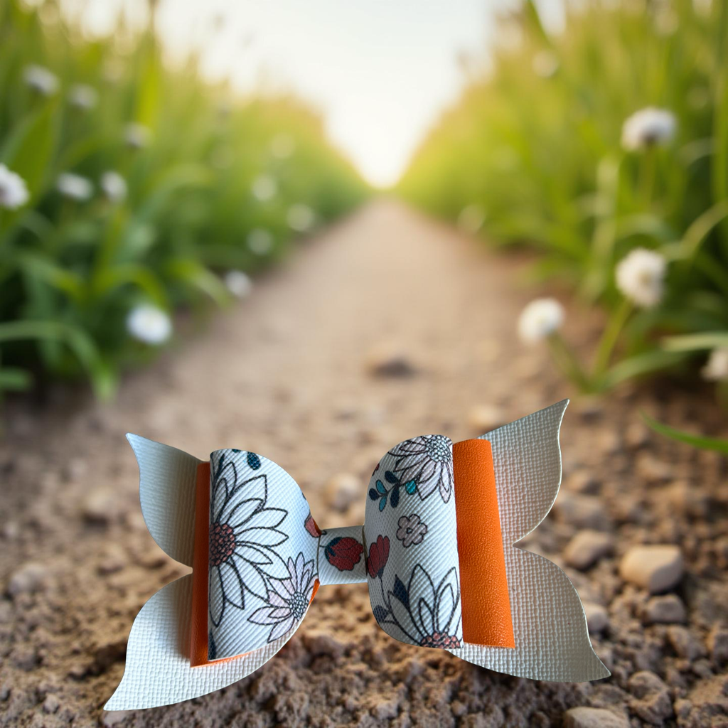 Bursting with botanical charm, this bow is a celebration of color and texture. A vibrant floral ribbon dances atop a crisp orange loop, all nestled on a white winged base that adds fluttery dimension. It’s like a garden breeze captured in ribbon form perfect for sunny strolls, spring picnics, or adding a touch of bloom to any outfit. Handcrafted with love and layered for delight, this bow brings nature’s palette to life.