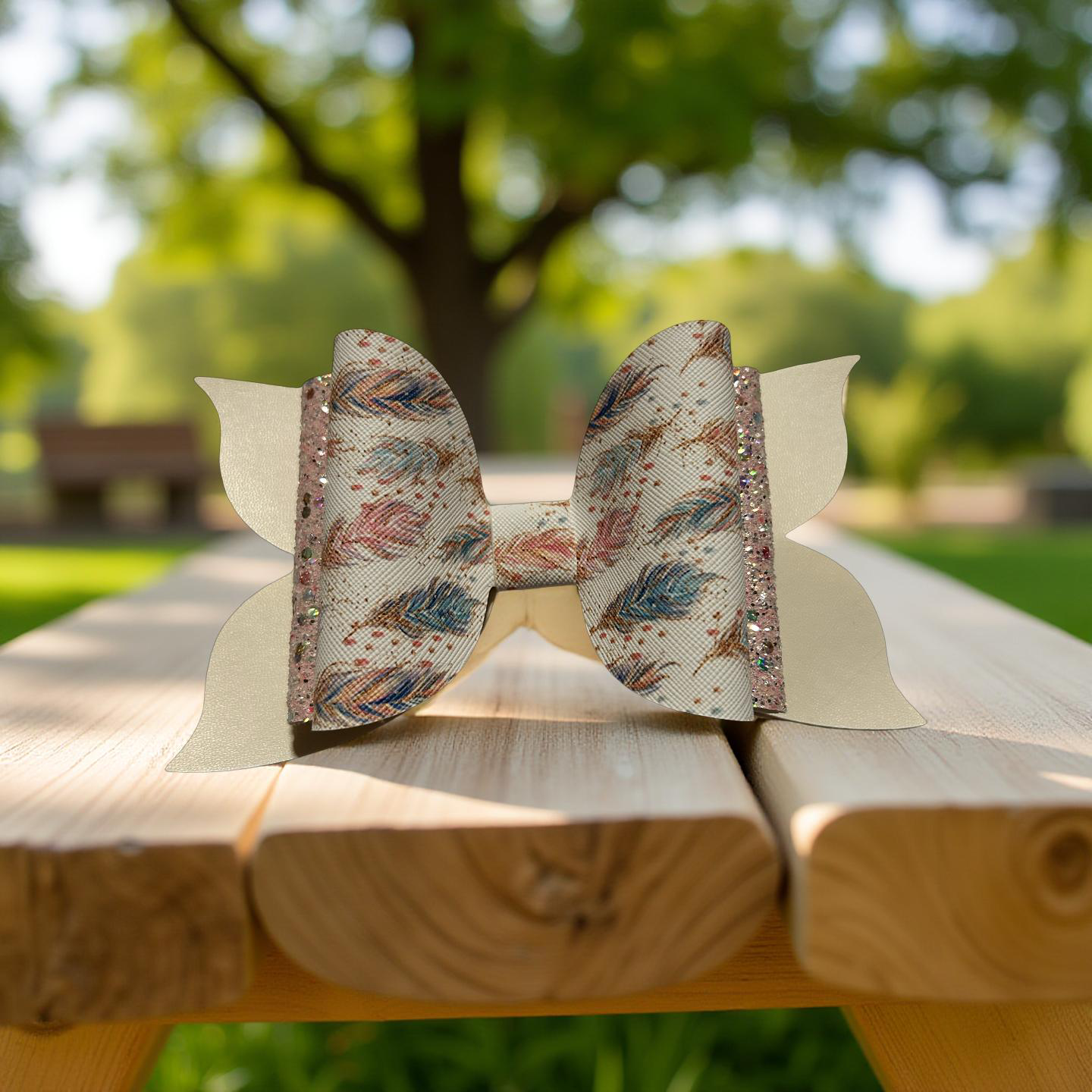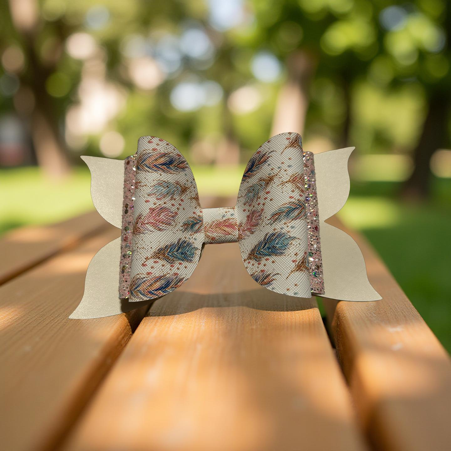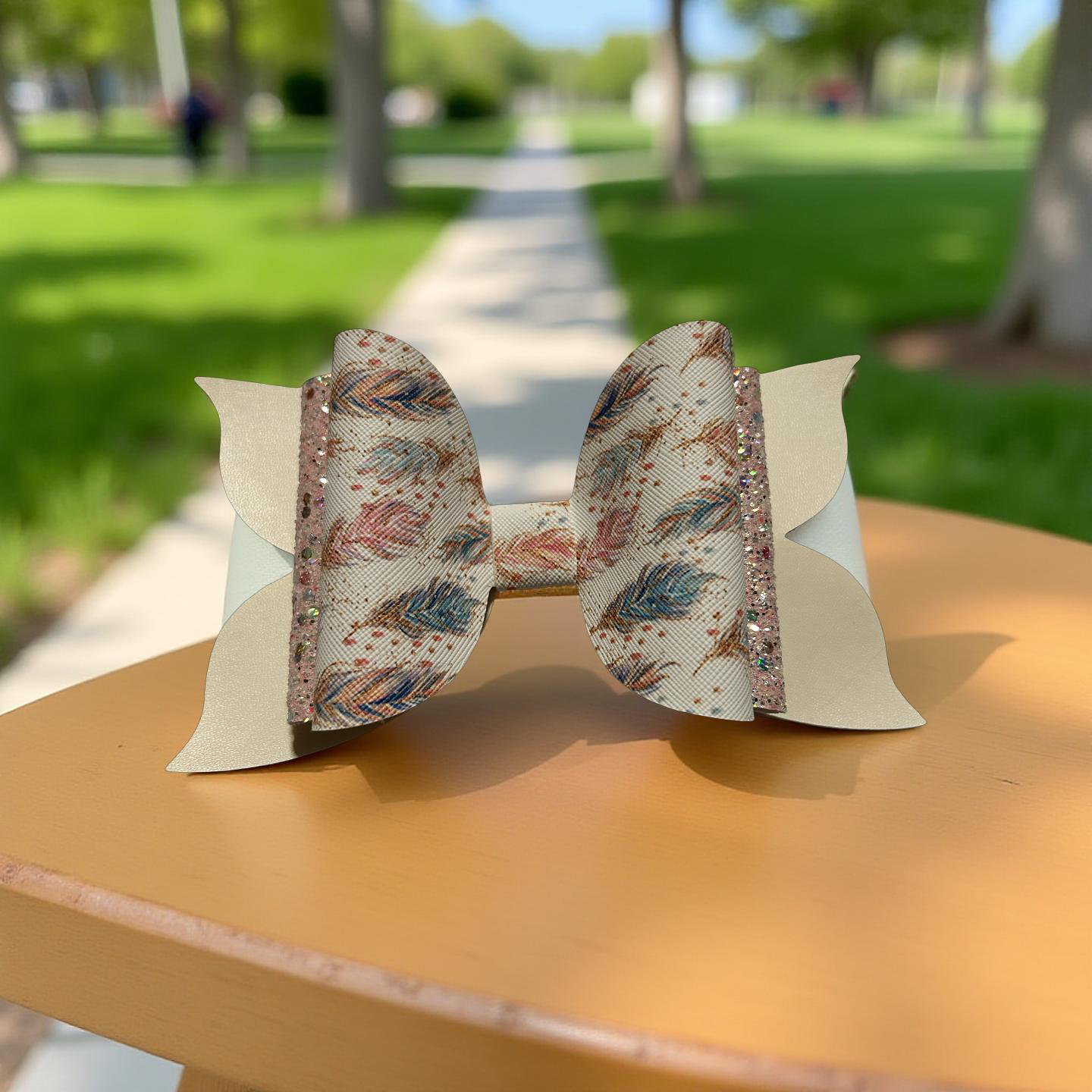 Float into whimsy with Featherlight—a biggie bow that’s soft, sparkly, and full of flair. Featuring a pastel feather print in shades of blue, pink, and orange, layered with shimmering glitter and creamy ribbon tails, this bow is perfect for gentle souls and daydreamers alike. Light as air, sweet as a breeze—it’s a flutter of magic for any outfit.
