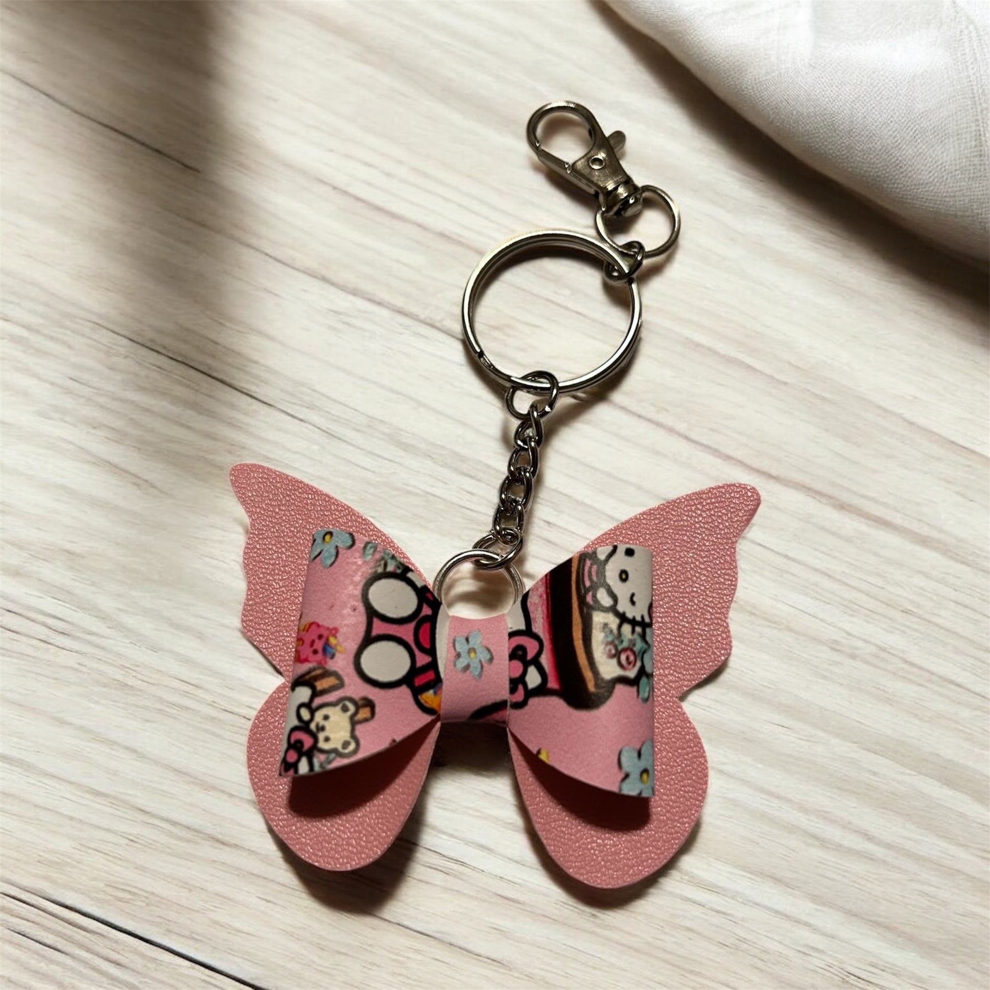 Sweet, sparkly, and full of charm — this butterfly-shaped keychain features a textured pink wing design and a center bursting with Hello Kitty and friends, surrounded by cheerful blue blossoms. It’s a flutter of nostalgia and cuteness, ready to clip onto your keys, bags, or lanyards for a dose of joy on the go.