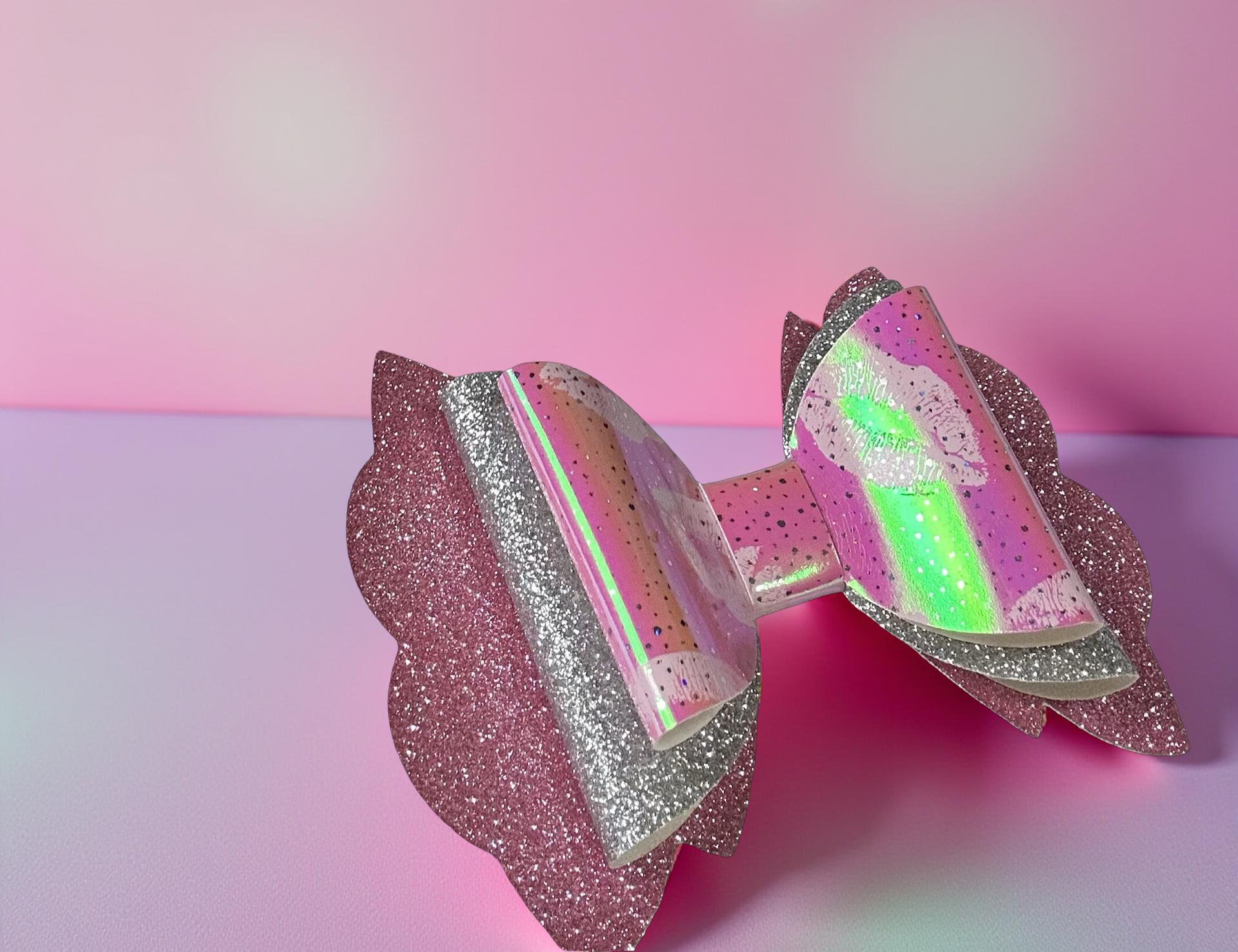 Add a little glam and a lot of love with this glittery pink bow! Featuring shimmering silver accents and playful lip prints, itβs the perfect accessory for Valentineβs Day, parties, or anytime you want to shine with a kiss of sparkle. ππ