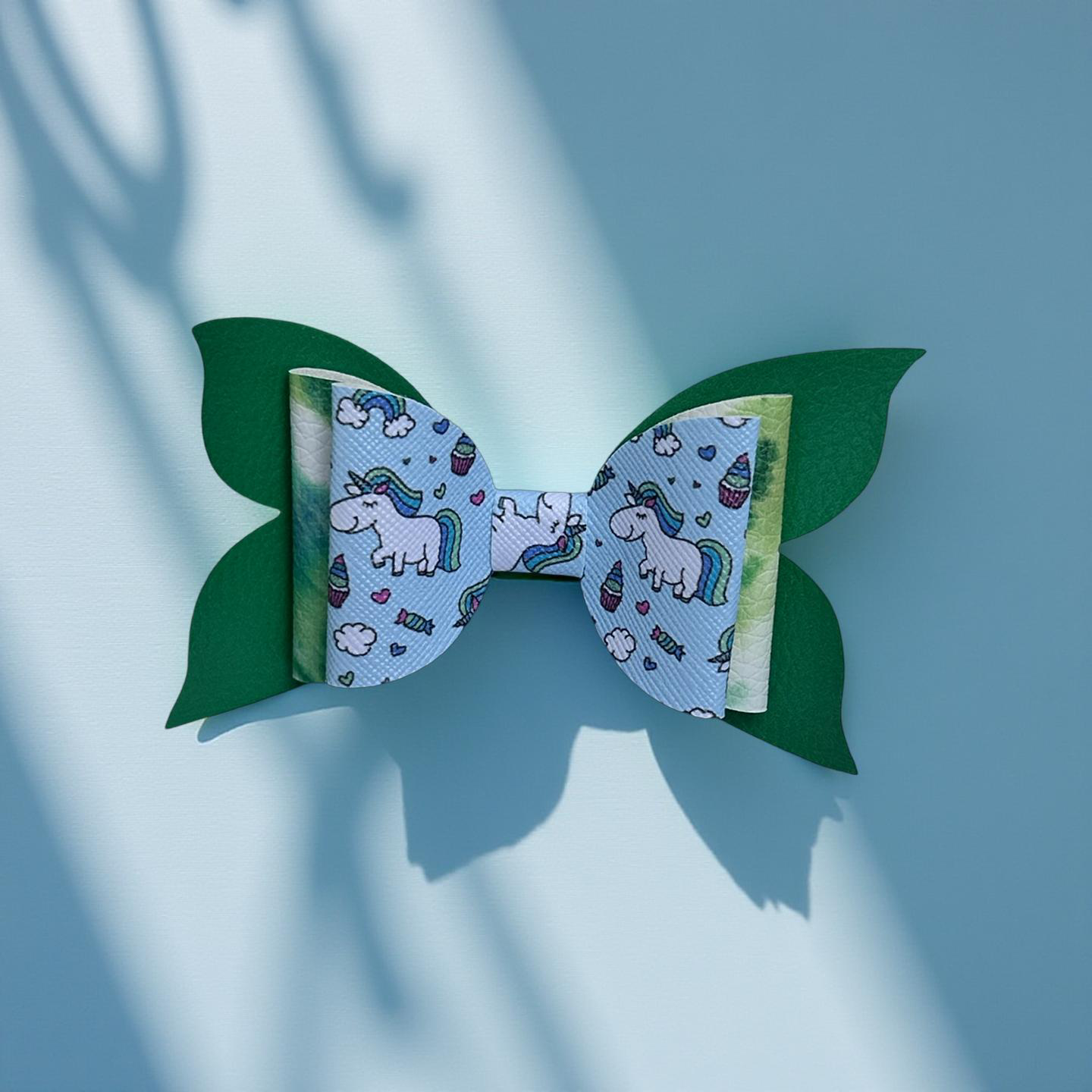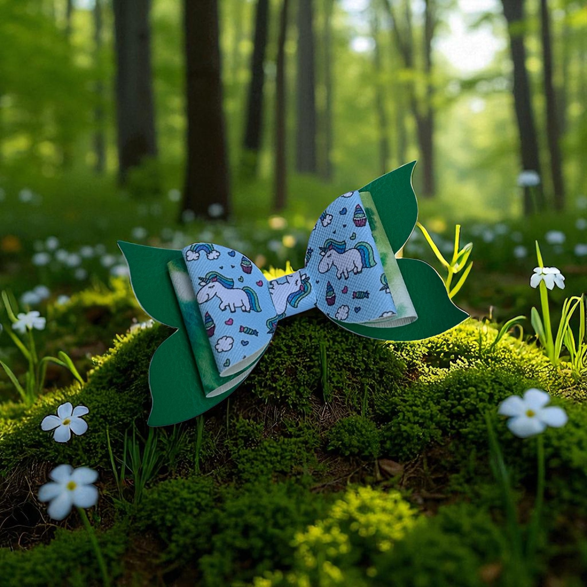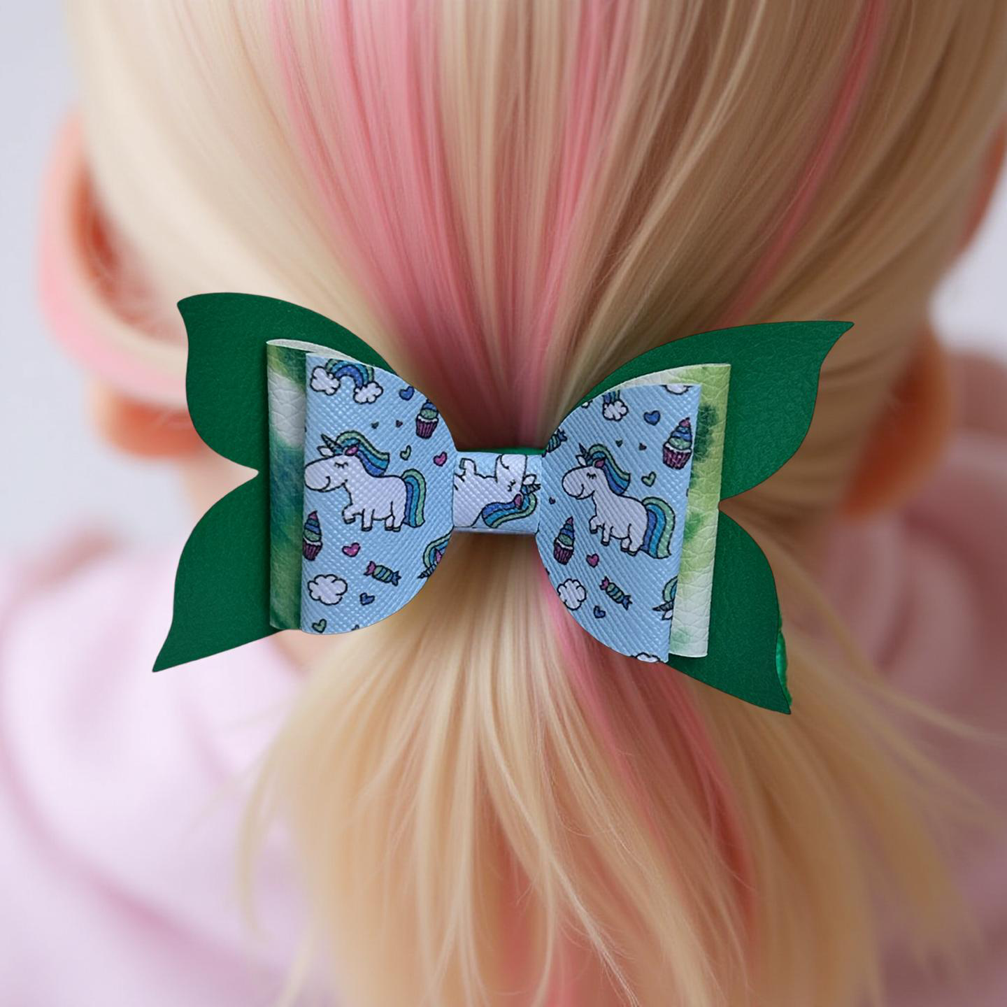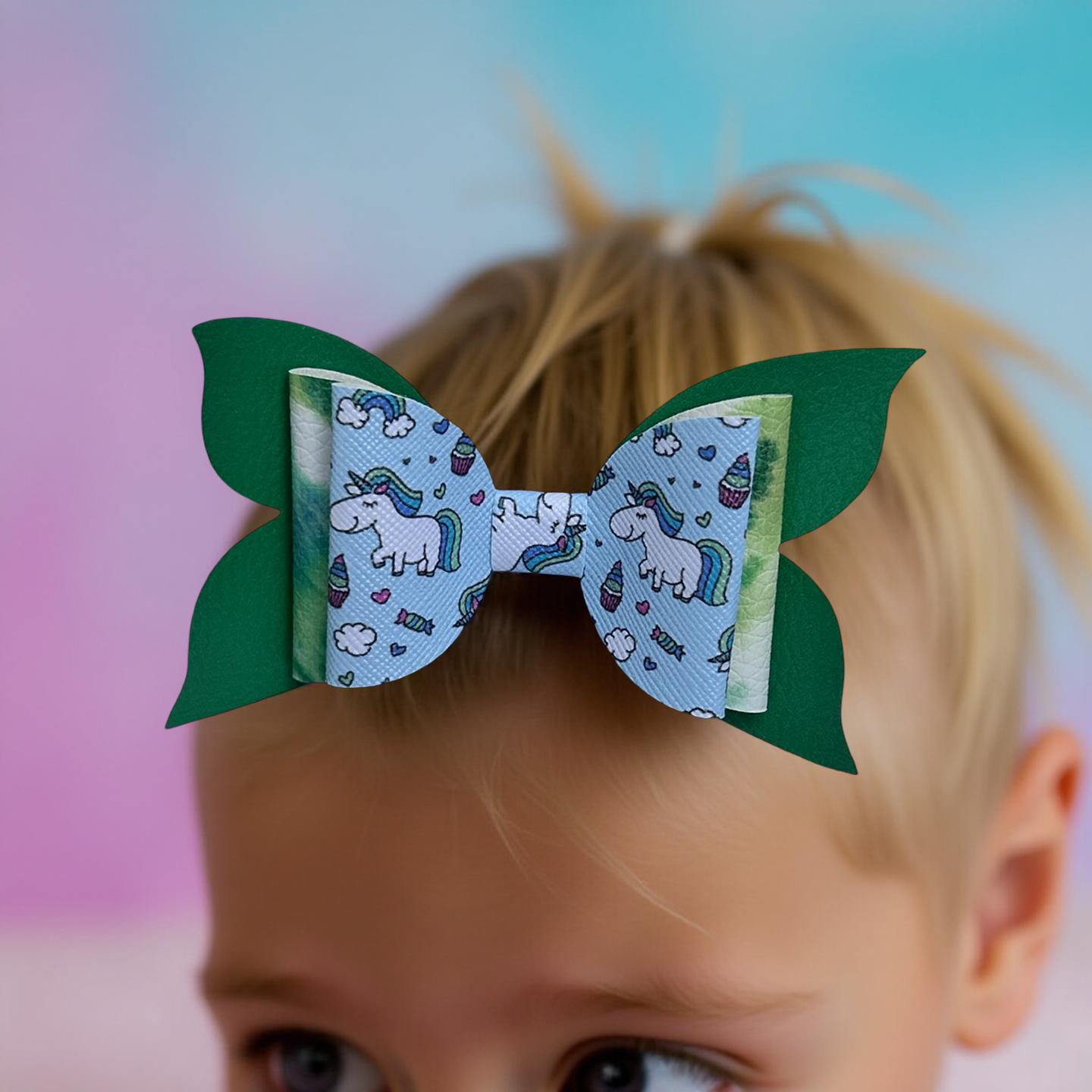 “Bring a sprinkle of unicorn magic to every day with this enchanting green hair bow! Featuring a whimsical unicorn design and a sparkling finish, this bow is perfect for adding a pop of color and fantasy to any outfit. Lightweight, comfy, and secured with a silver alligator clip, it’s a must-have accessory for every unicorn lover!” 🦄✨💚