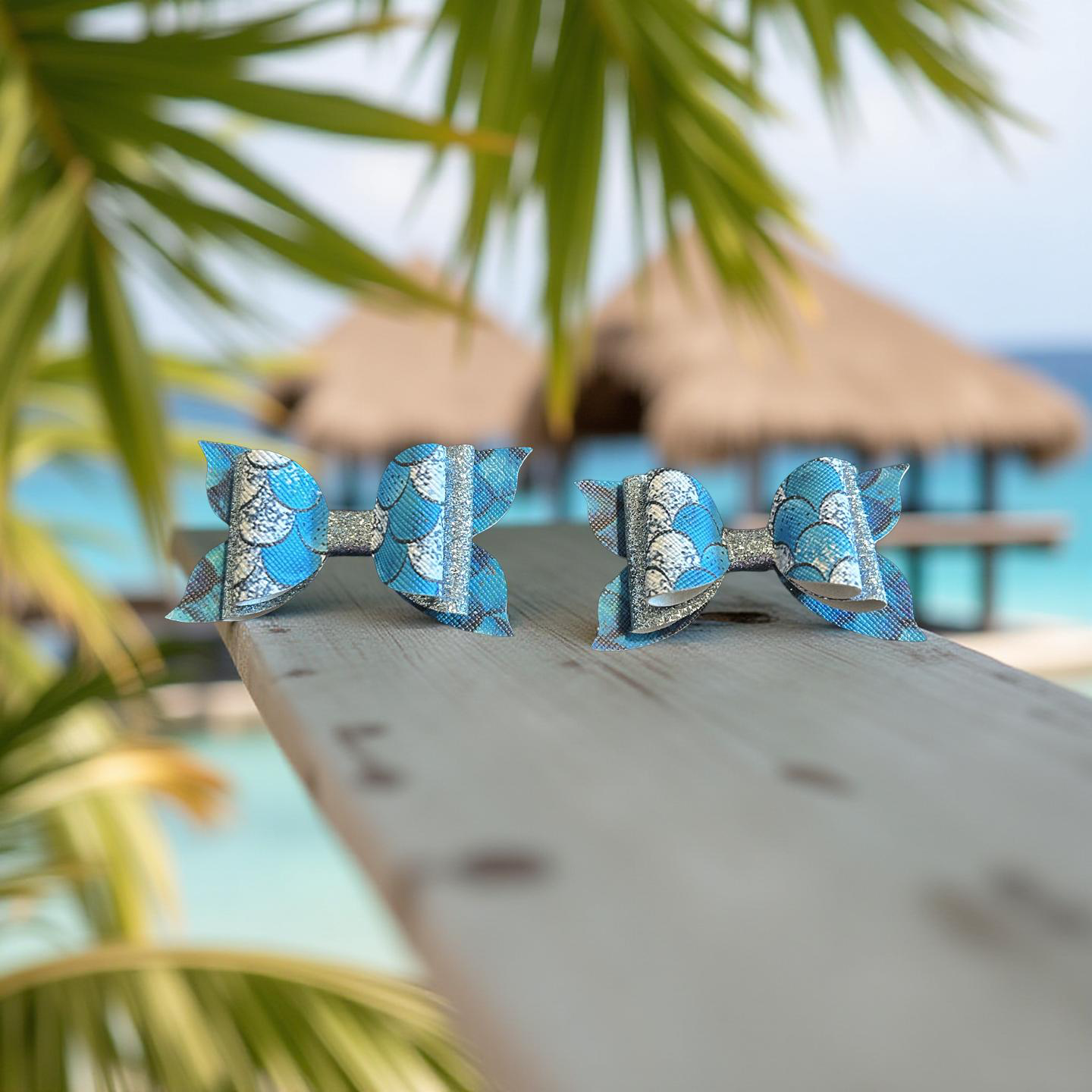 Make a splash with these shimmering bite-size bows! Featuring dreamy blue scales and a touch of silver sparkle, they’re perfect for little mermaids (or sea-loving pets) who love a wave of cuteness. Lightweight, secure, and sold as a pair—tiny treasures from under the sea! 🌊✨