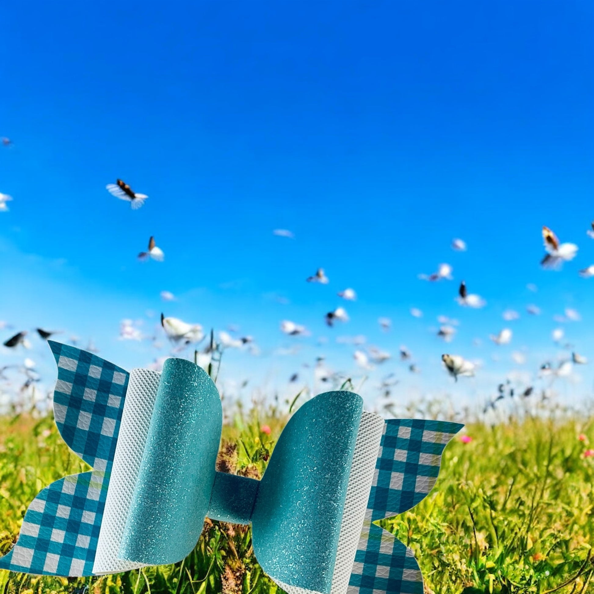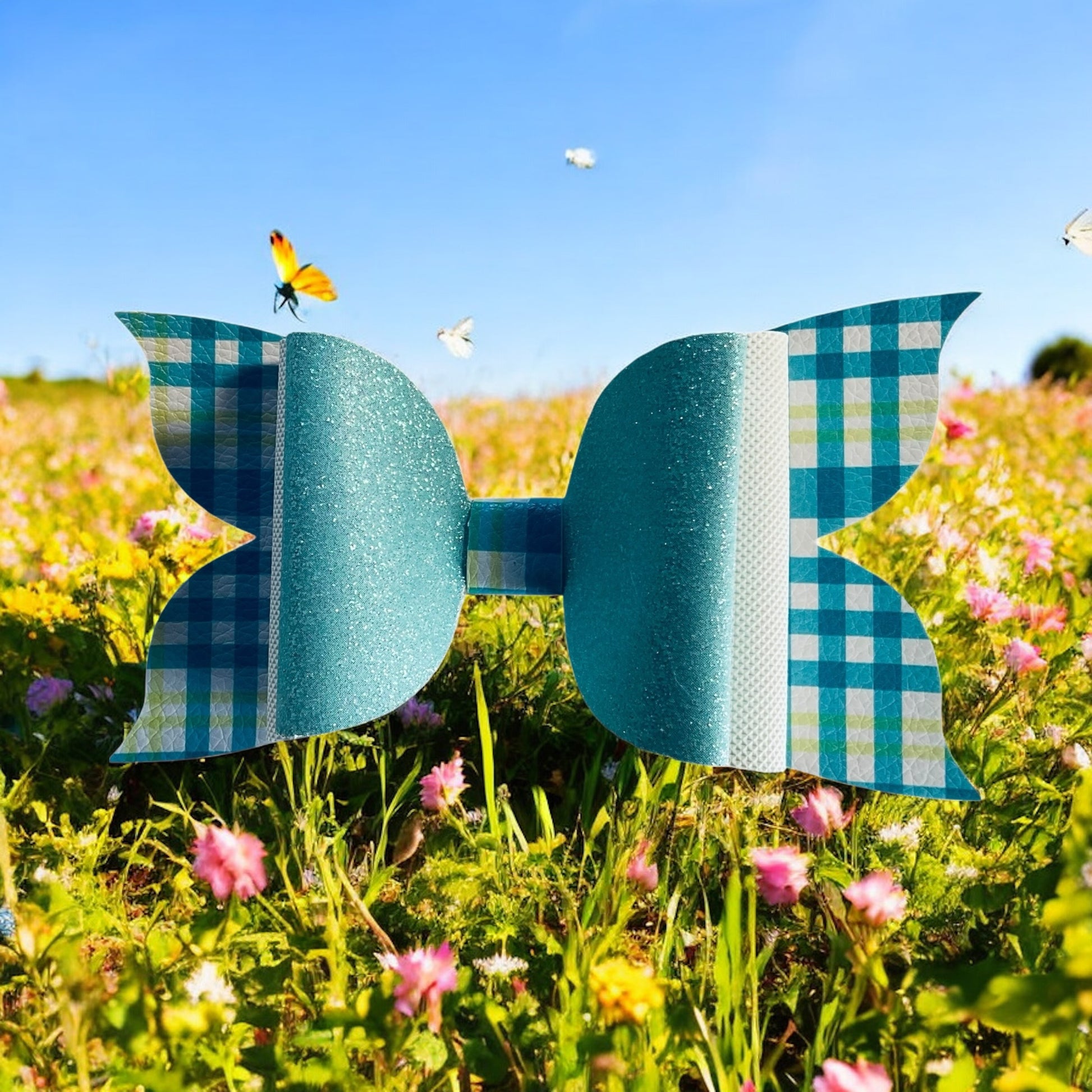 Where glitter meets gingham! This bow mixes turquoise sparkle with a classic plaid twist, creating a look that’s both bold and playful. Ideal for trendsetters who love a little retro sass.