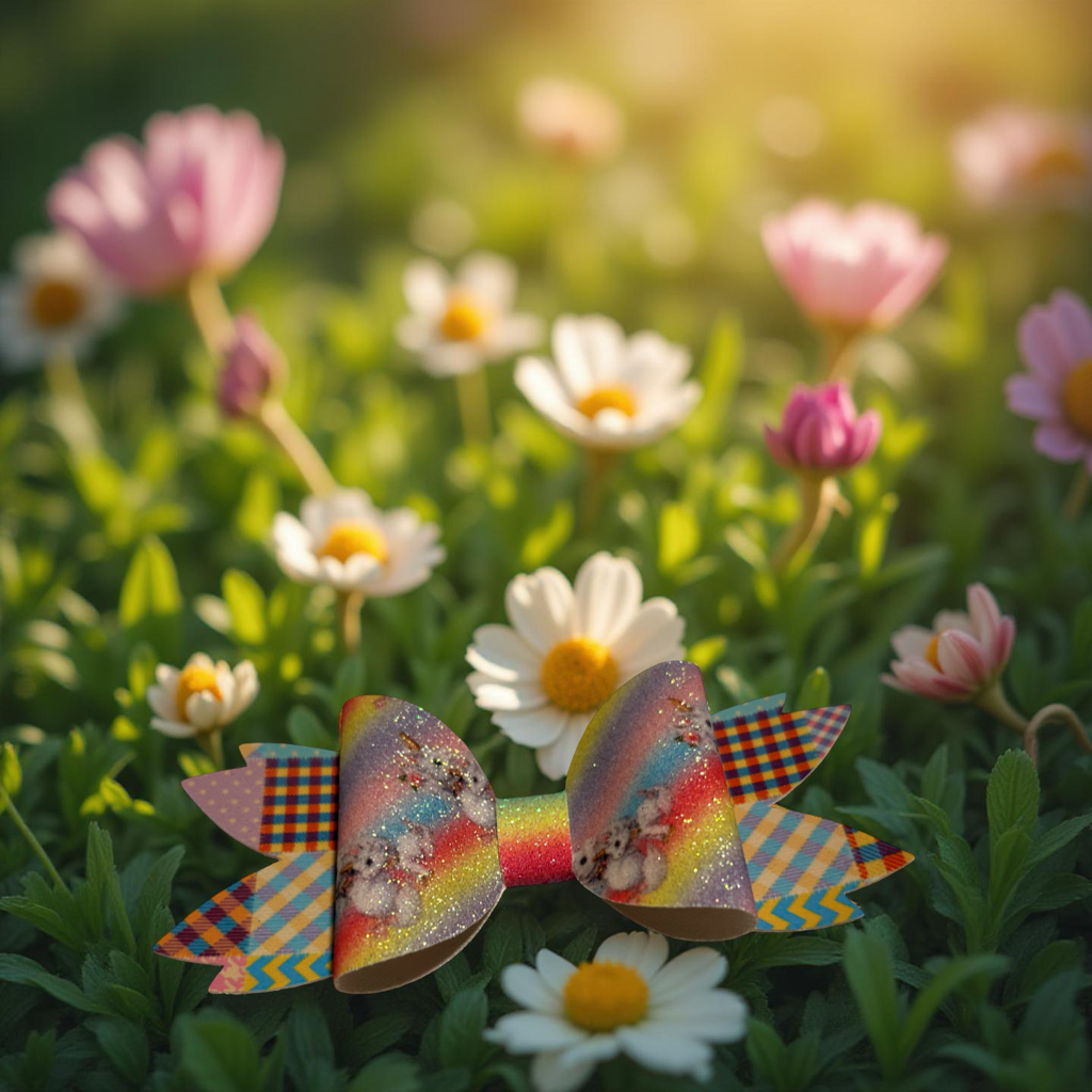 A celebration of color, sparkle, and pure joy! This layered bow features a glittery unicorn centerpiece surrounded by playful petals in plaid, polka dots, chevron, and pastel solids. It’s a mini masterpiece of textures and patterns perfect for dreamers, dancers, and anyone who believes in a little everyday magic