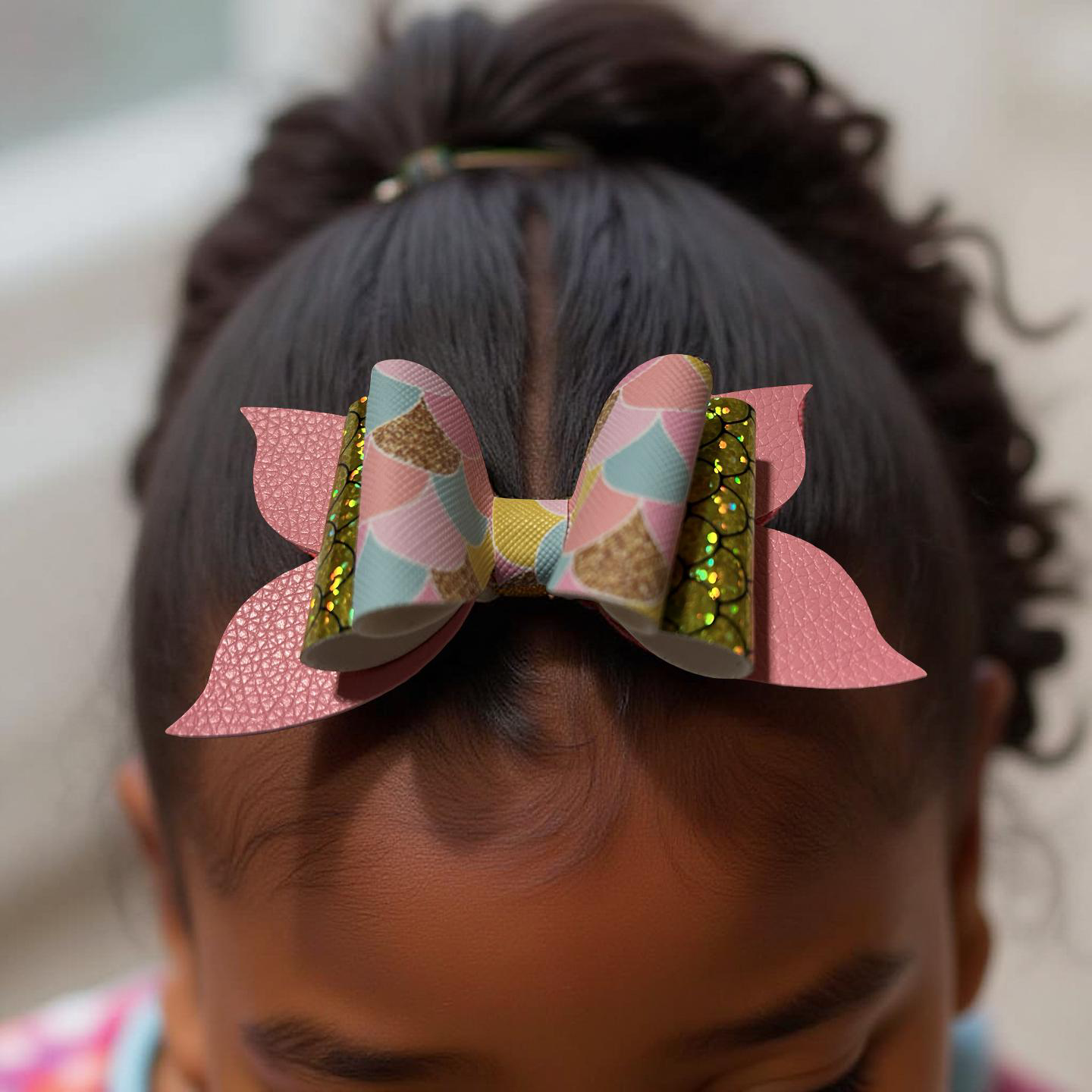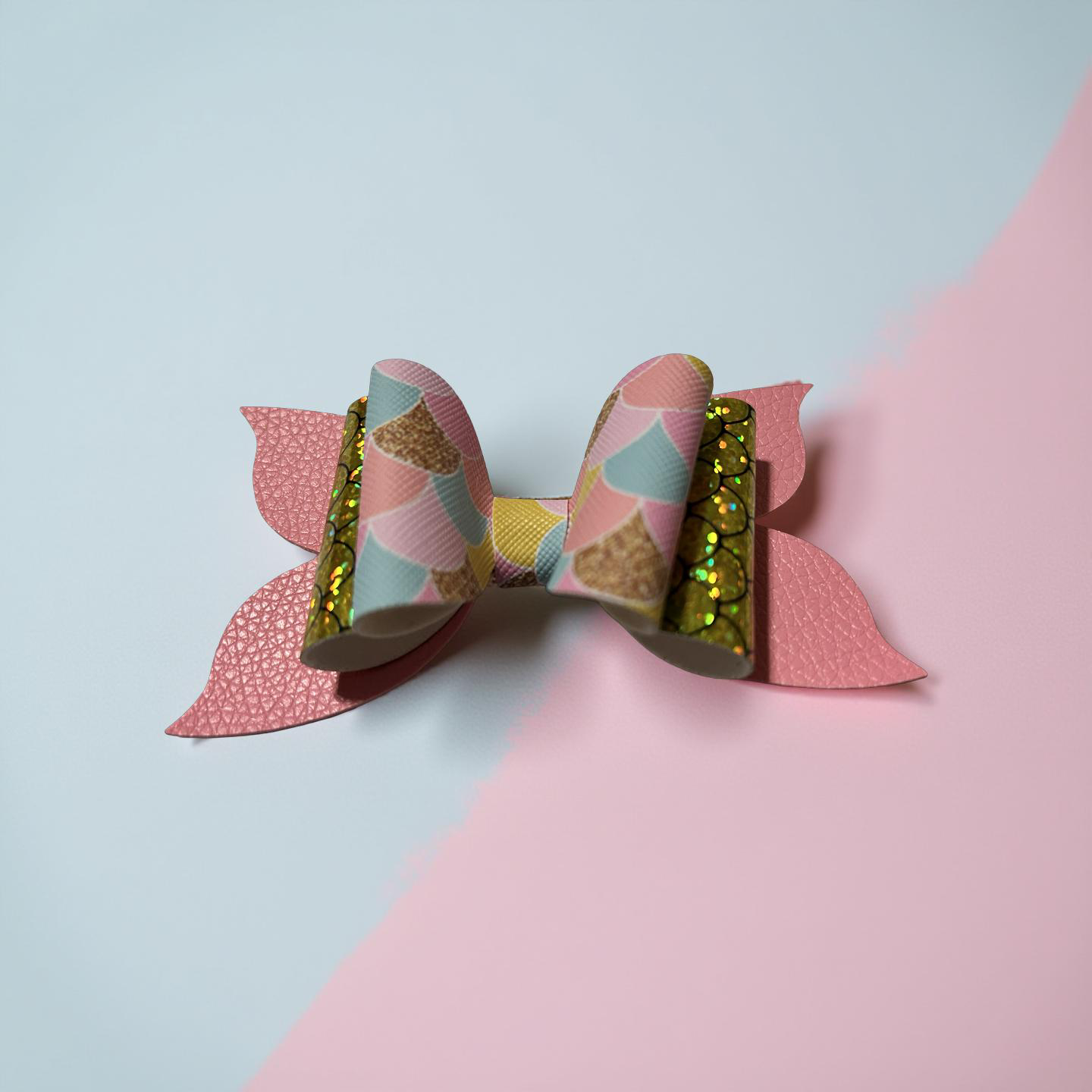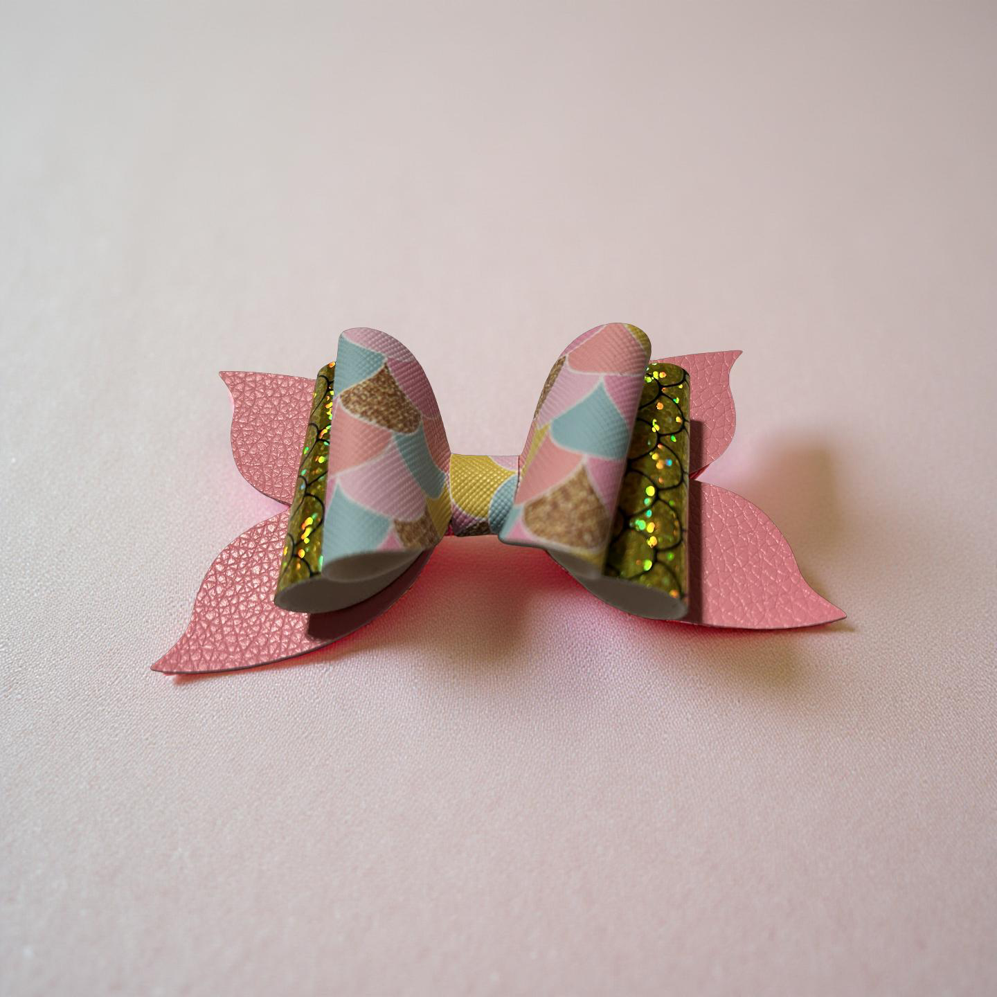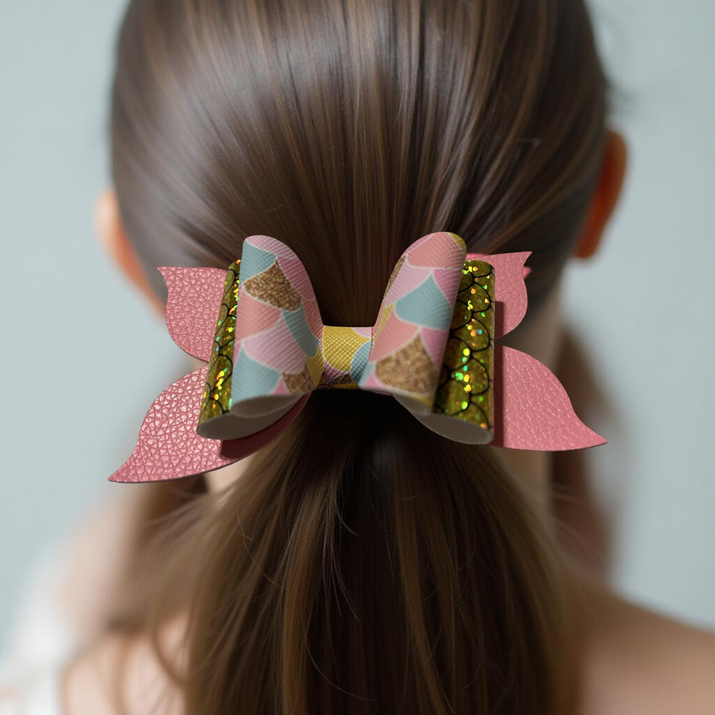 Dive into shimmer! This bow blends pastel mermaid scales, golden sequins, and soft pink faux leather for a look that’s equal parts glam and ocean magic. It’s perfect for sea-loving sweethearts and sparkle chasers alike.