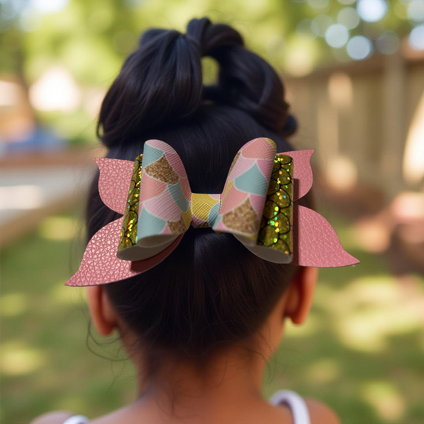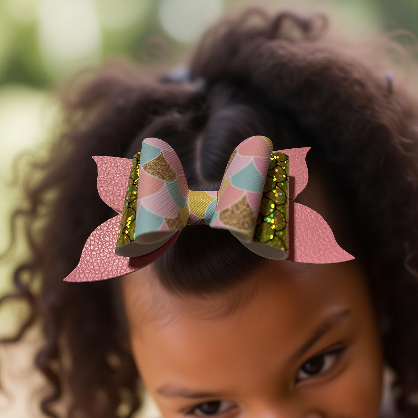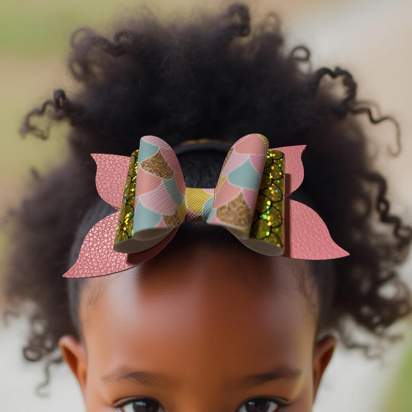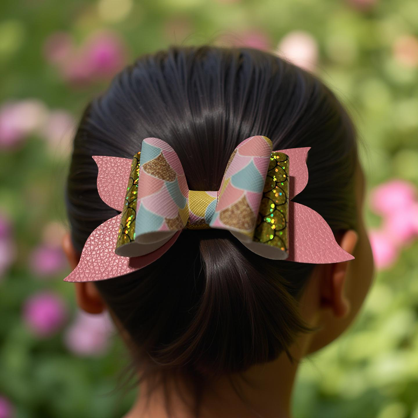Dive into shimmer! This bow blends pastel mermaid scales, golden sequins, and soft pink faux leather for a look that’s equal parts glam and ocean magic. It’s perfect for sea-loving sweethearts and sparkle chasers alike.