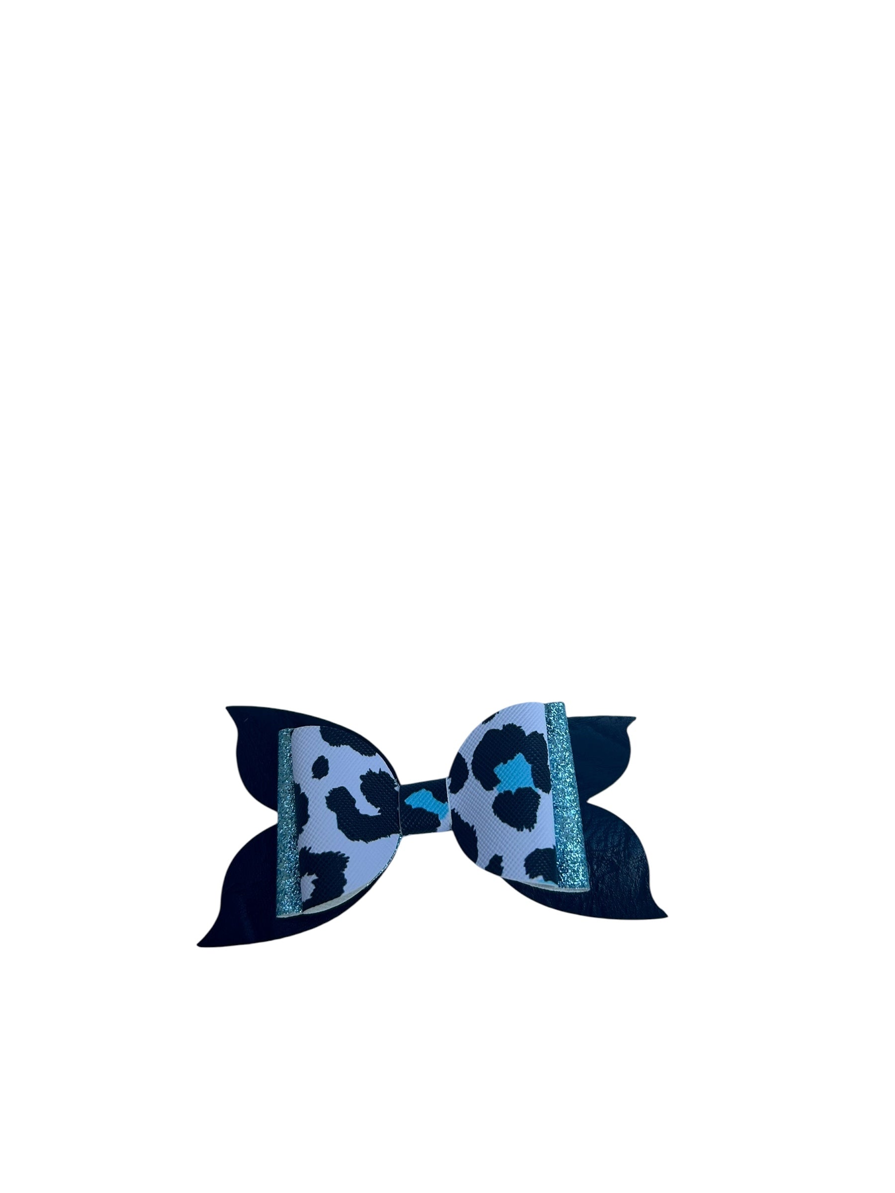 A playful mix of cow print, glitter, and a pop of blue! This bow is the perfect blend of country charm and girly sparkle — a must-have for little ones who love to shine with a touch of farmyard fun.