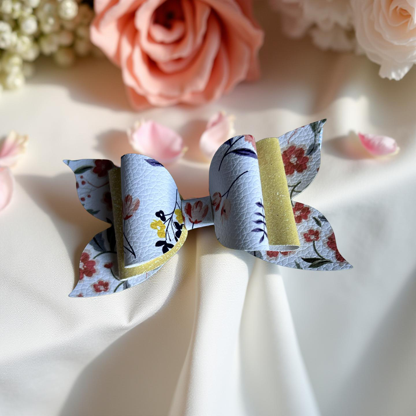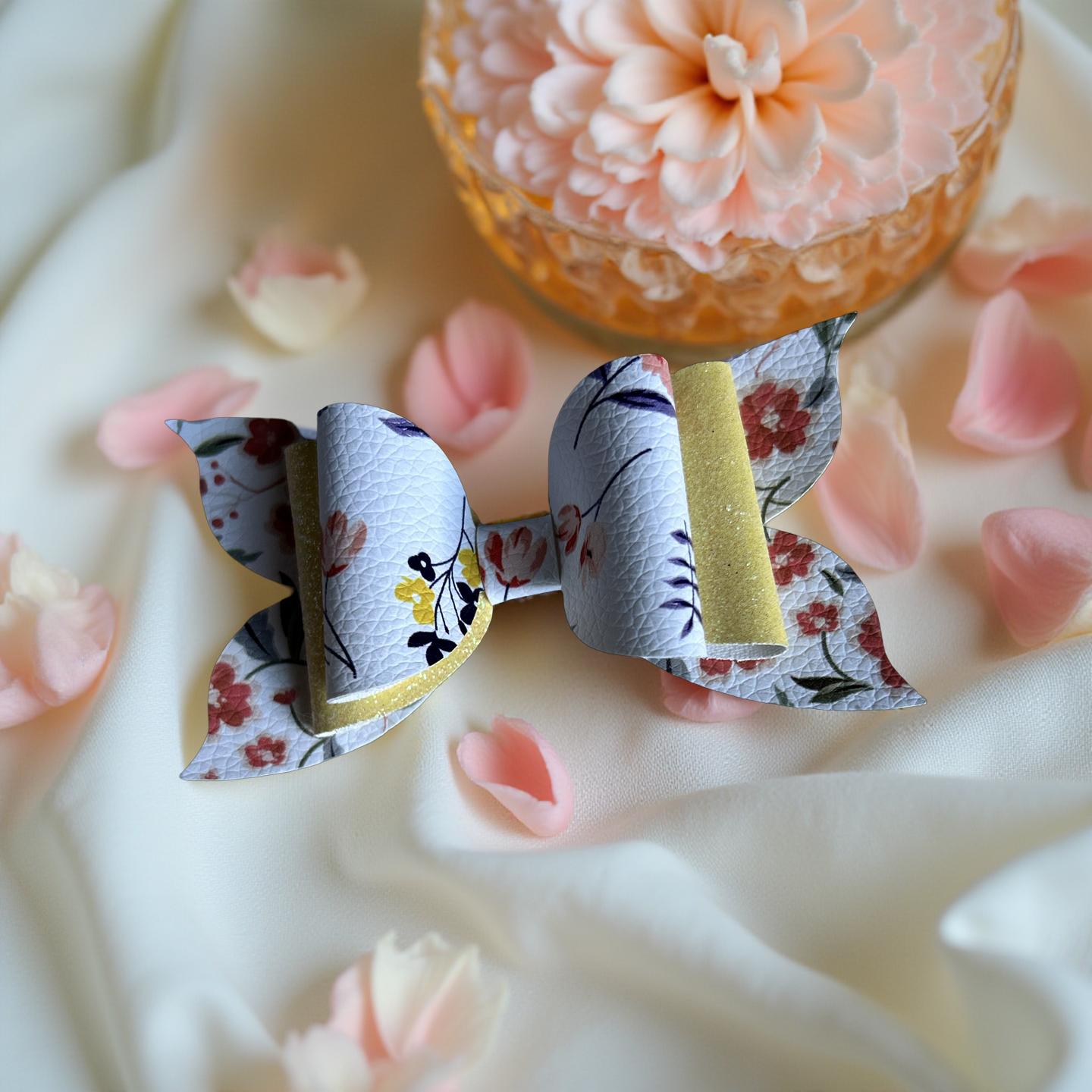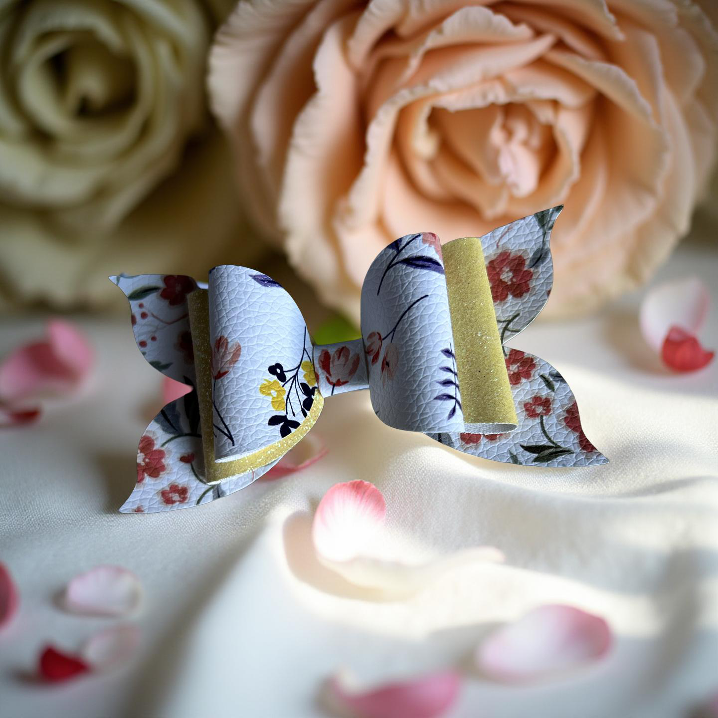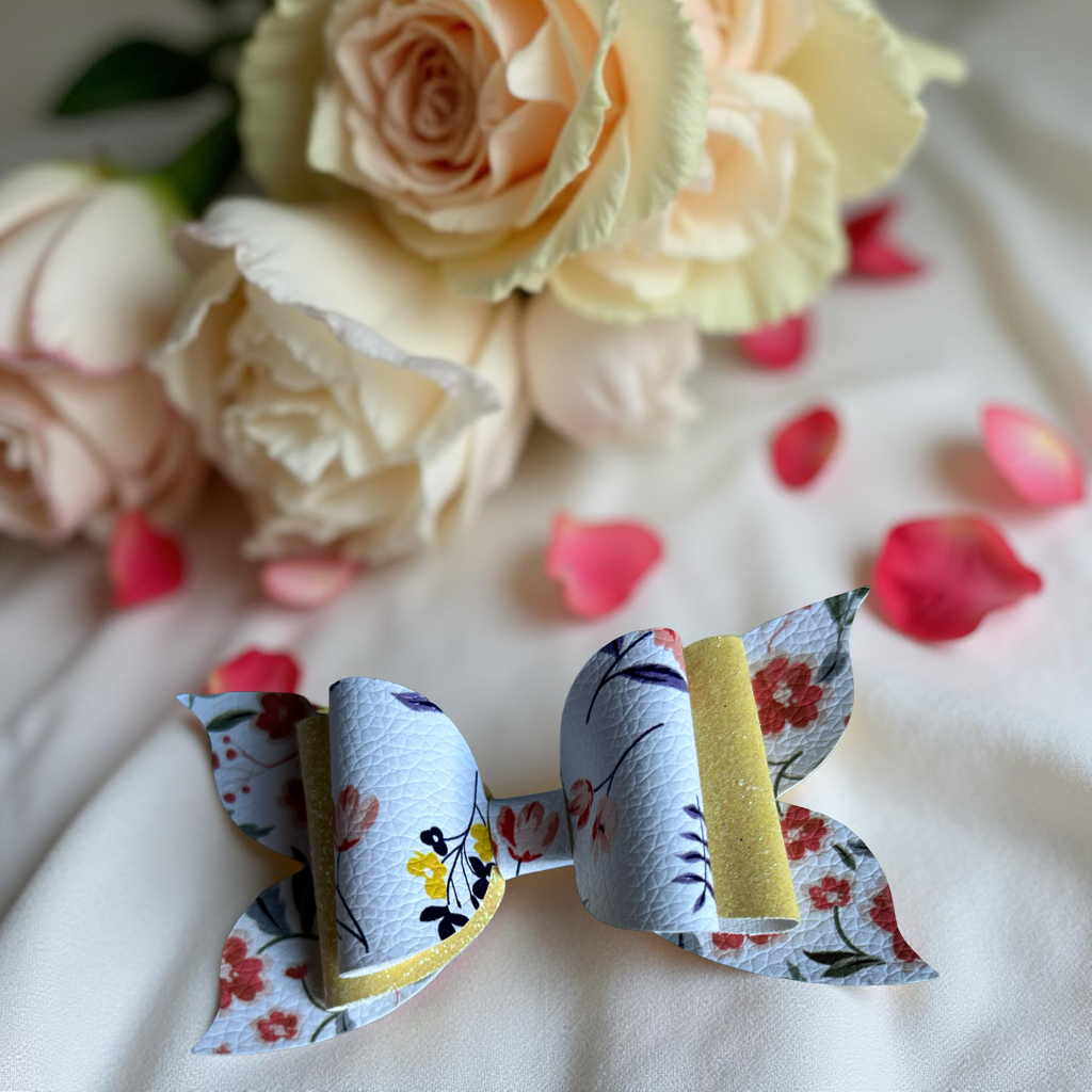 Where sparkle meets floral charm! This bow features a lively garden print in bold reds, yellows, and blacks, set against a crisp white backdrop. A glittery golden strip adds a dash of sunshine, while leaf-shaped ends give it a fresh-from-the-meadow feel. It’s a radiant blend of texture and whimsy—ideal for brightening up your day or gifting a little golden joy.”