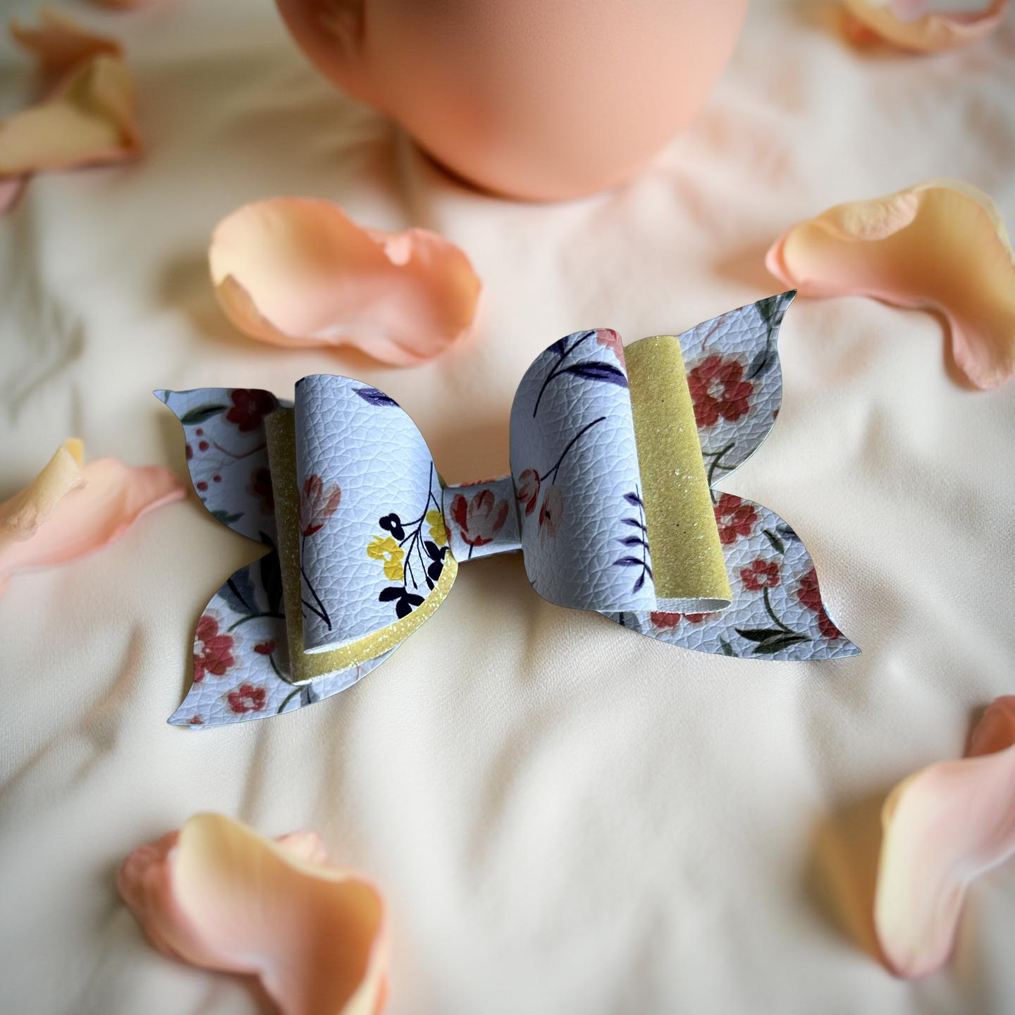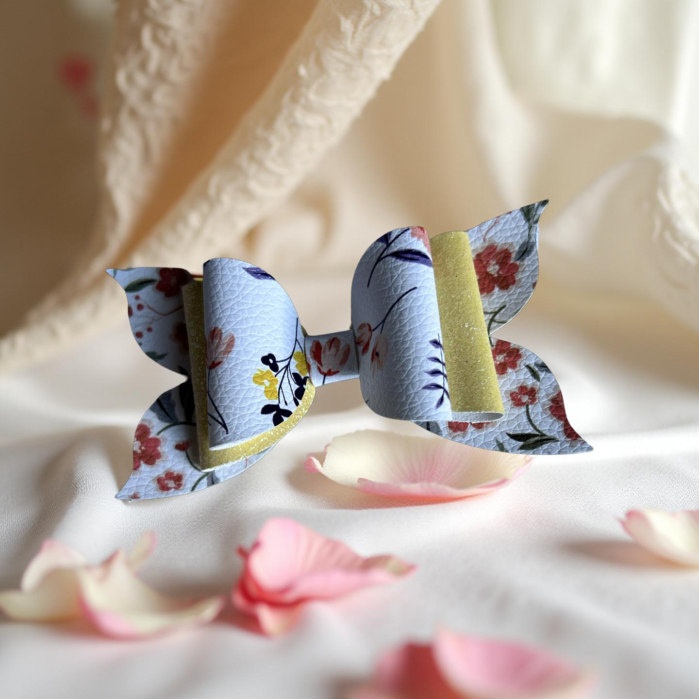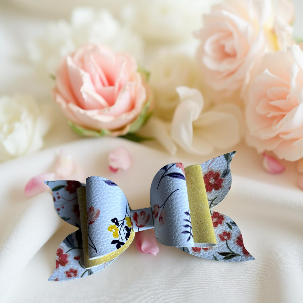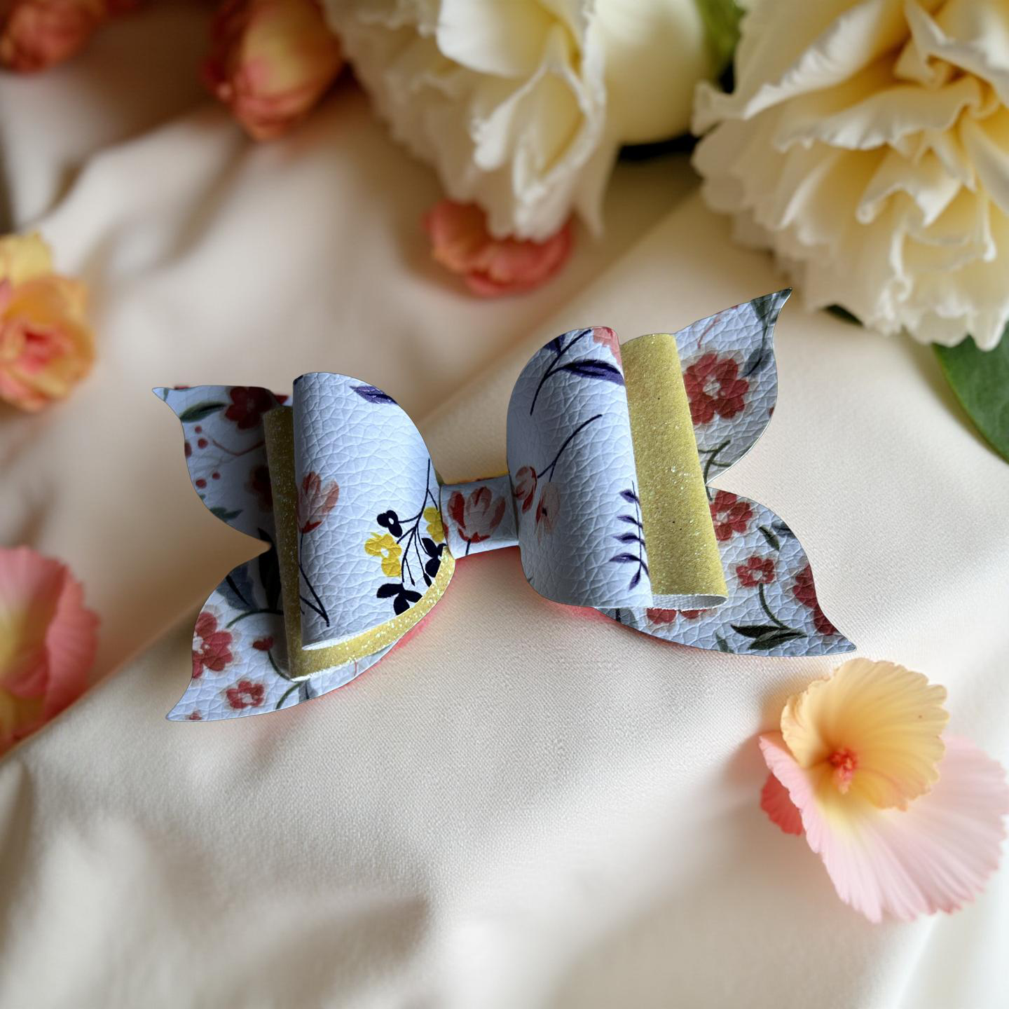 Where sparkle meets floral charm! This bow features a lively garden print in bold reds, yellows, and blacks, set against a crisp white backdrop. A glittery golden strip adds a dash of sunshine, while leaf-shaped ends give it a fresh-from-the-meadow feel. It’s a radiant blend of texture and whimsy—ideal for brightening up your day or gifting a little golden joy.”