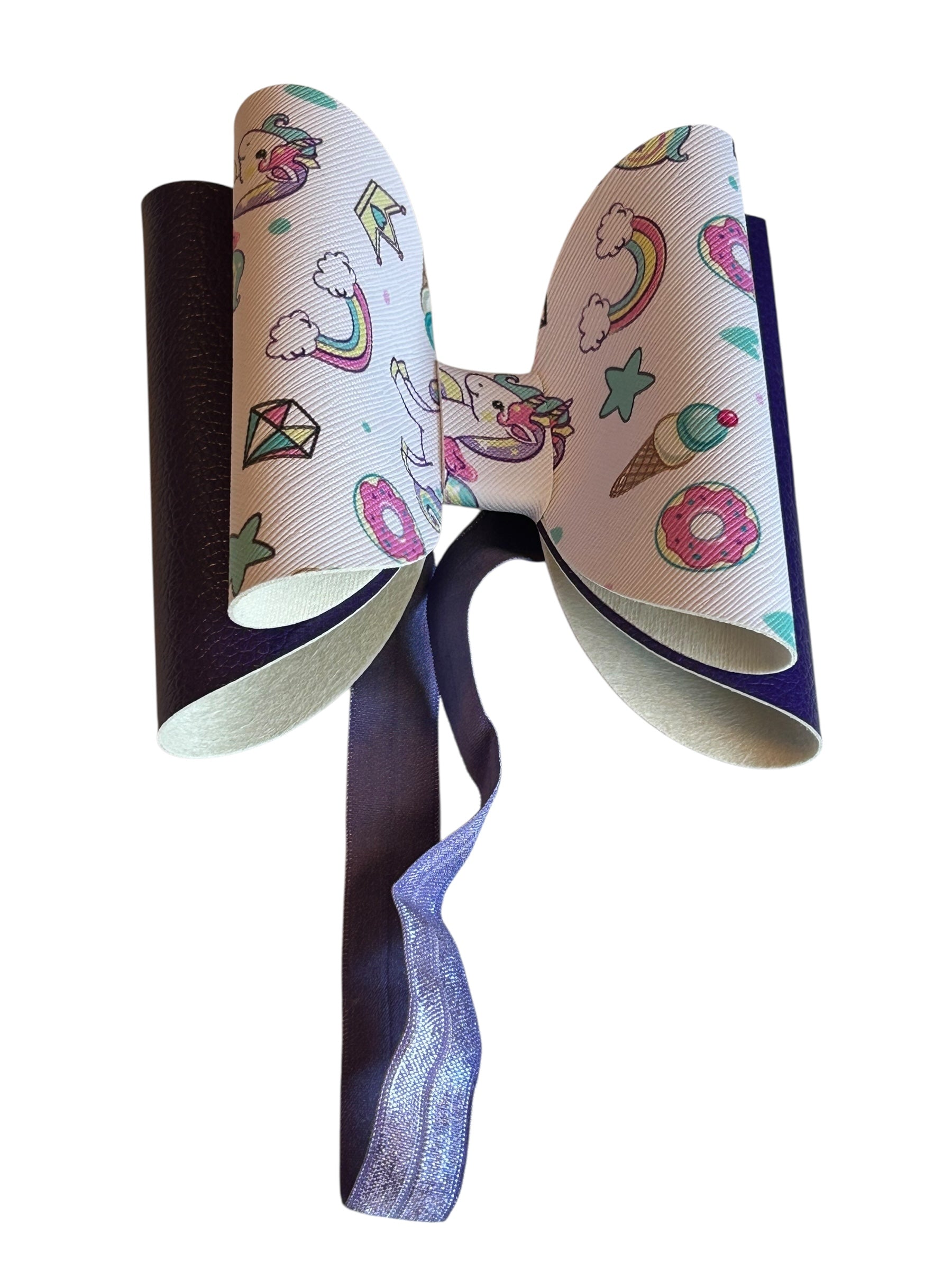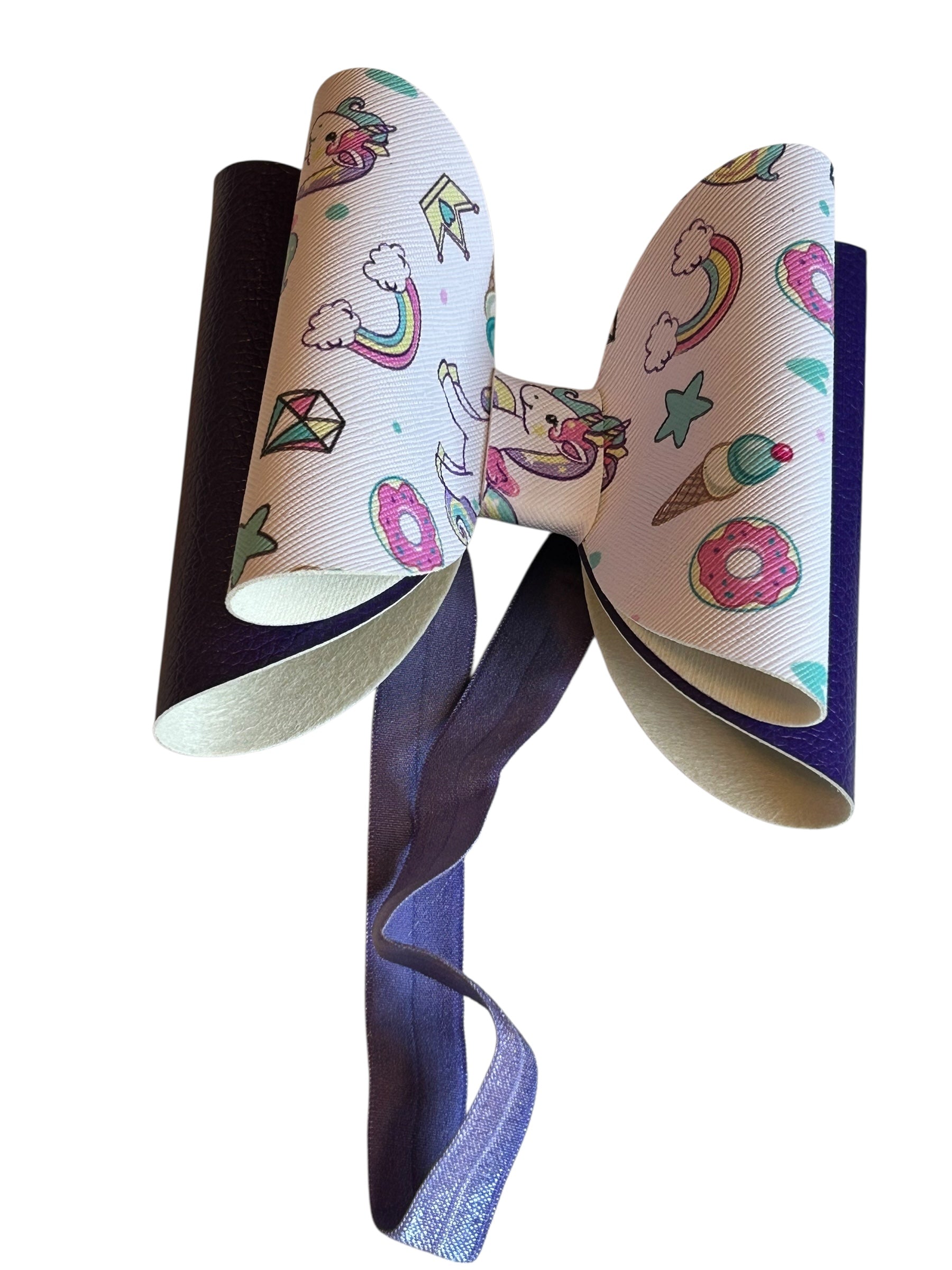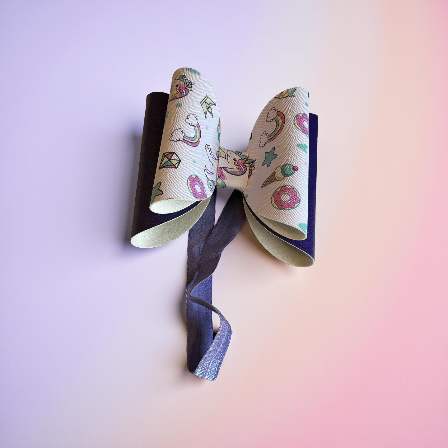 A pastel playground of pure joy! This whimsical bow is sprinkled with unicorns, donuts, ice cream cones, stars, and more—like a dream journal come to life. Paired with a shiny dark purple ribbon and a soft, stretchy purple band, it’s comfy enough for everyday wear and cute enough for any celebration. Perfect for little sweethearts who believe in magic, munchies, and rainbow wishes.