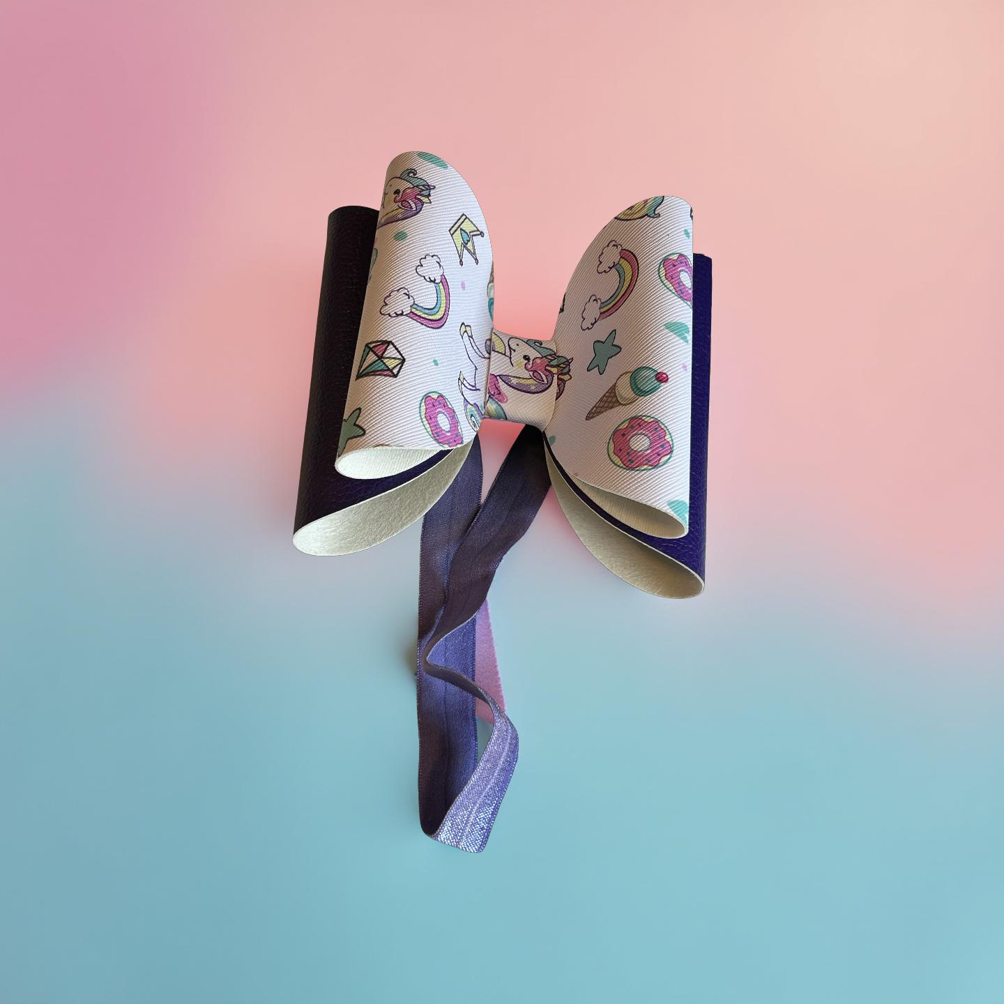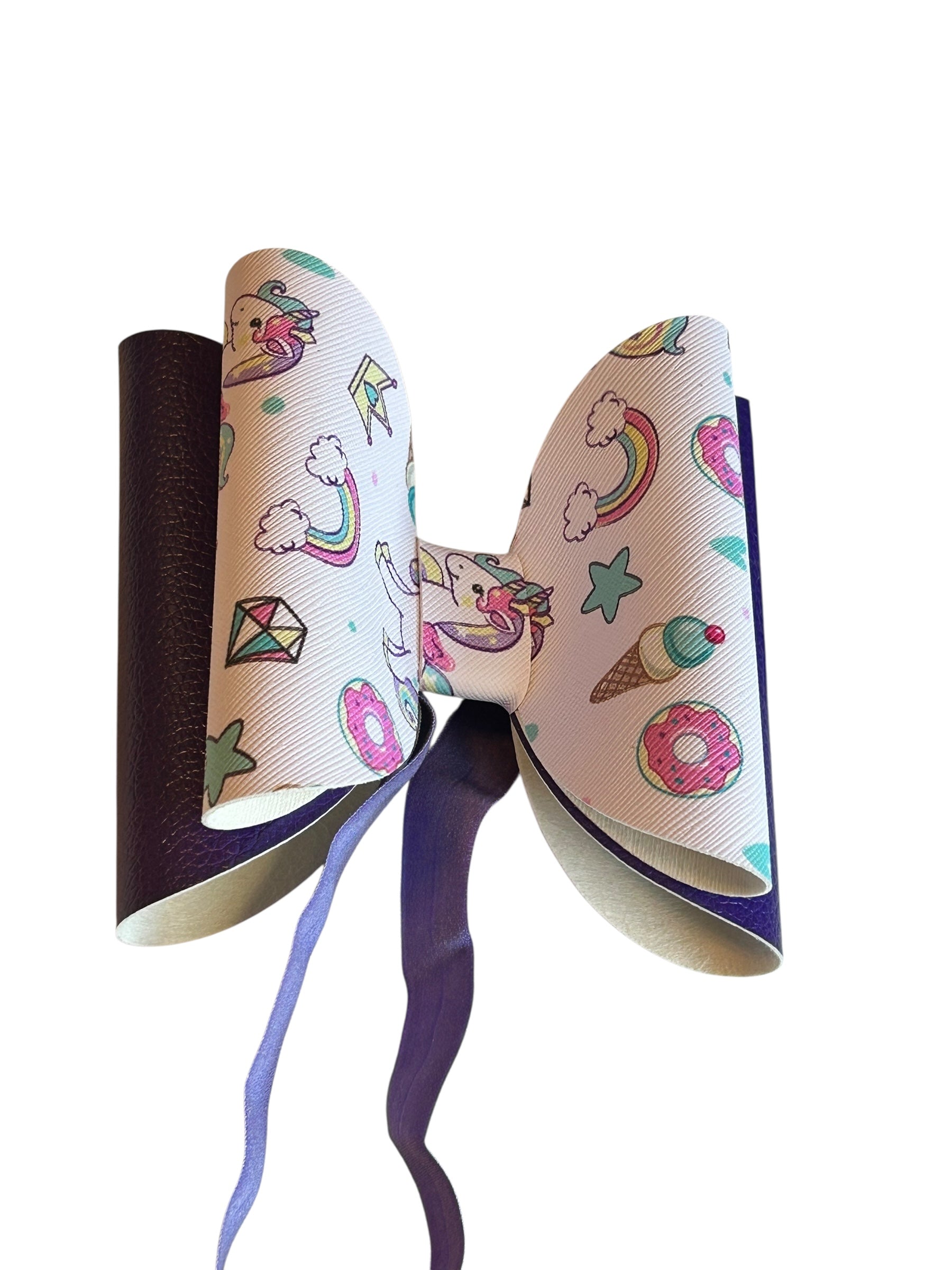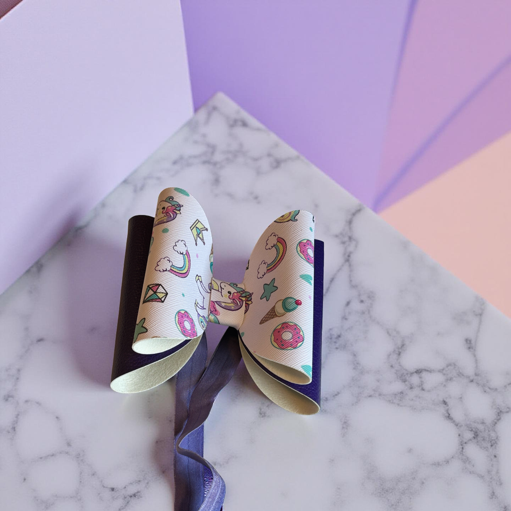 A pastel playground of pure joy! This whimsical bow is sprinkled with unicorns, donuts, ice cream cones, stars, and more—like a dream journal come to life. Paired with a shiny dark purple ribbon and a soft, stretchy purple band, it’s comfy enough for everyday wear and cute enough for any celebration. Perfect for little sweethearts who believe in magic, munchies, and rainbow wishes.