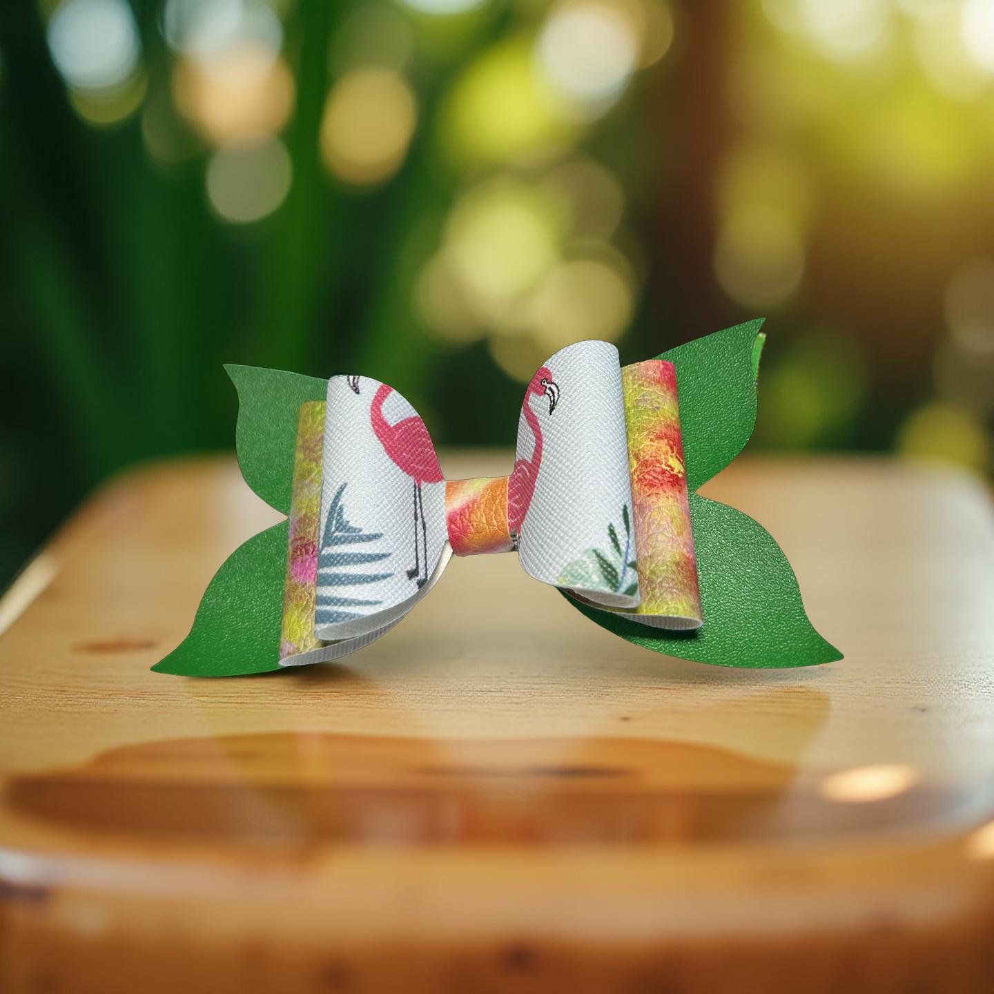 Say hello to sunshine with this tropical stunner! Featuring a vibrant flamingo print ribbon nestled between lush green leaf accents, this bow channels vacation vibes and poolside playfulness. Whether you’re dreaming of island breezes or just want a pop of paradise in your day, this handcrafted beauty brings the tropics to your tresses. Perfect for summer strolls, luau parties, or just flamingling around.