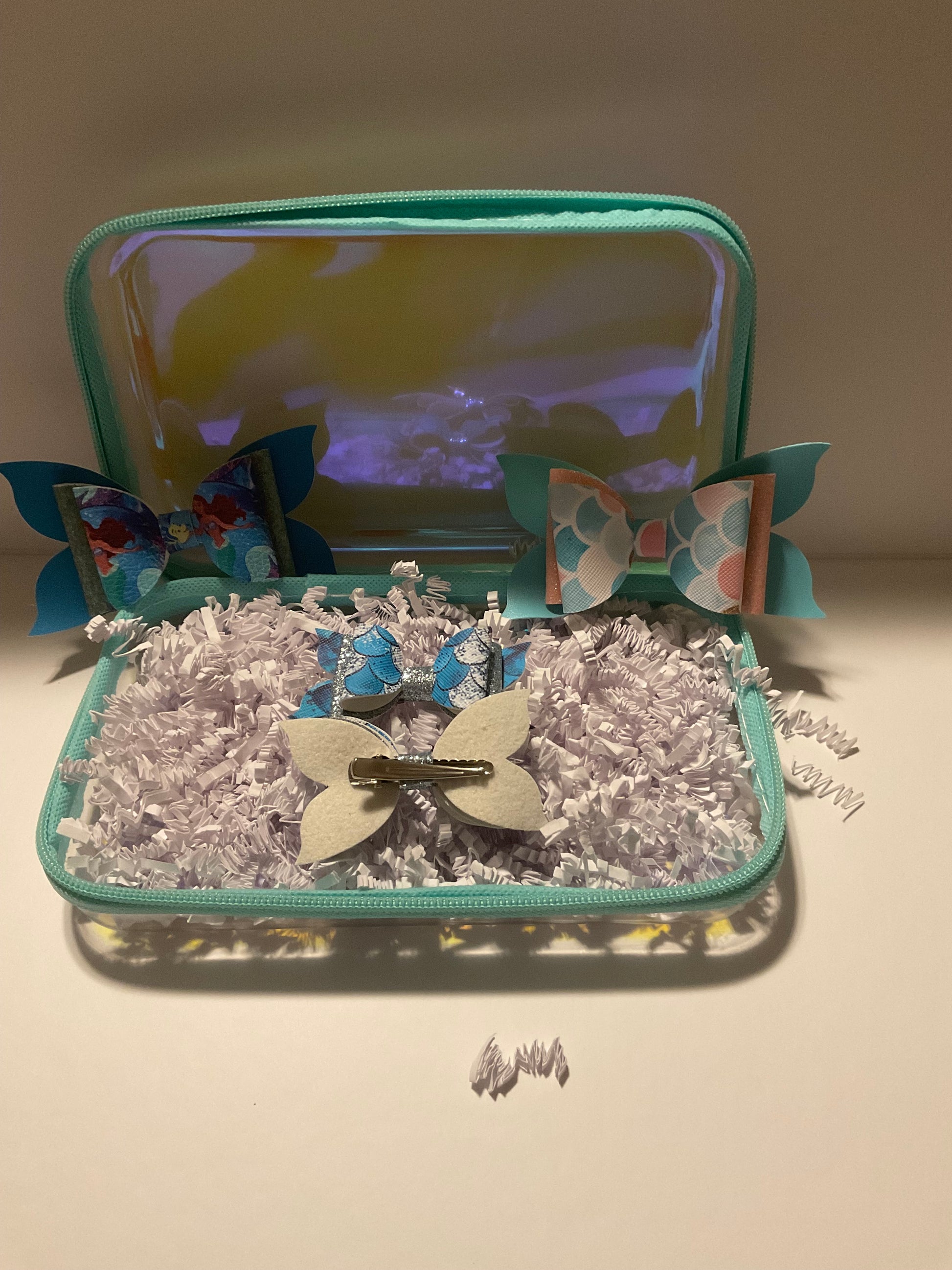 Dive into a dreamy tide of shimmer and scales! This enchanting set features one pair of bite-size bows and two standard-size bows, all nestled in a turquoise zippered case with a peek-through lid and crinkle paper fluff like treasure tucked in a seashell. Each bow is a splash of ocean magic, from pastel mermaid scales to glittery seafoam swirls. Perfect for gifting, collecting, or adding a splash of sea-sational charm to any outfit. Mermaid-approved and ready to make waves!
