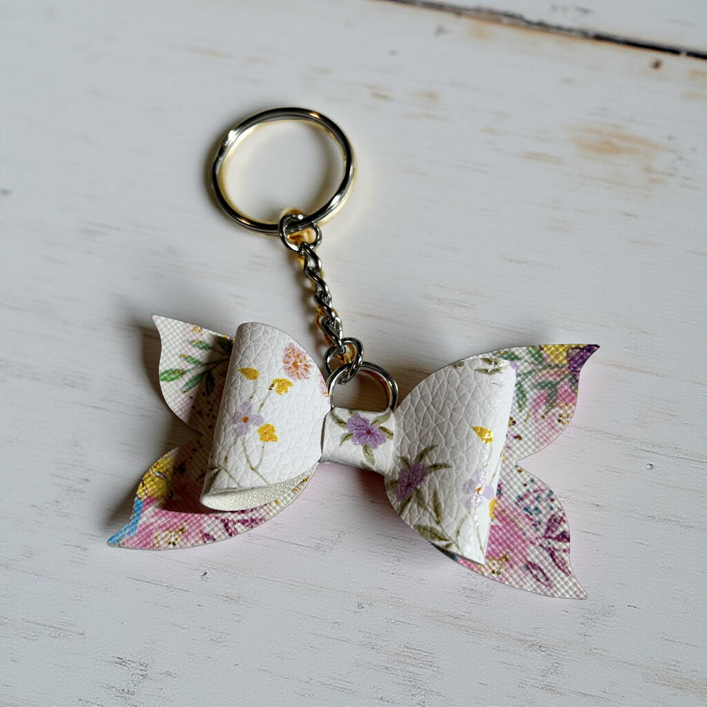 Like a stroll through a blooming meadow, this bow keychain is bursting with floral delight. Featuring a textured white base sprinkled with pink, yellow, green, and purple blossoms, it’s layered for dimension and tied with love. Clip it to your keys or bag for a touch of nature’s magic no watering required!